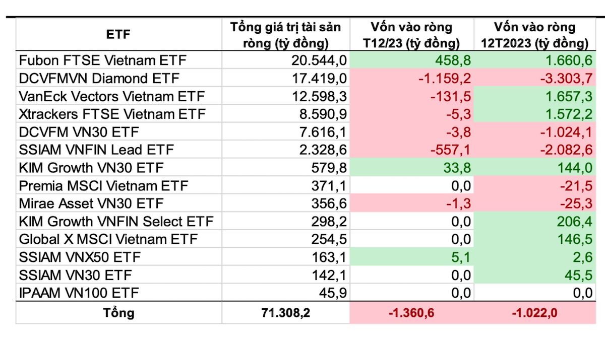 Mặc dù có khởi đầu với dòng vốn vào ròng mạnh mẽ trong các tháng đầu năm, tuy nhiên kết thúc năm 2023, các quỹ ETF lớn tại Việt Nam đã ghi nhận tổng dòng vốn bị rút ròng lên tới 1.022 tỉ đồng. Theo ông Nguyễn Bá Khương - chuyên viên phân tích tại Công ty Chứng khoán VNDIRECT, tính riêng tháng 12.2023, dòng vốn bị rút là gần 1.361 tỉ đồng. Trong đó phần lớn đến từ việc bị rút ròng của quỹ DCVFMVN Diamond ETF (bị rút ròng 1.159,2 tỉ đồng), quỹ VNFIN Lead ETF của SSIAM (bị rút ròng 557 tỉ đồng) và quỹ VanEck Vectors Vietnam ETF (bị rút ròng 131,5 tỉ đồng).