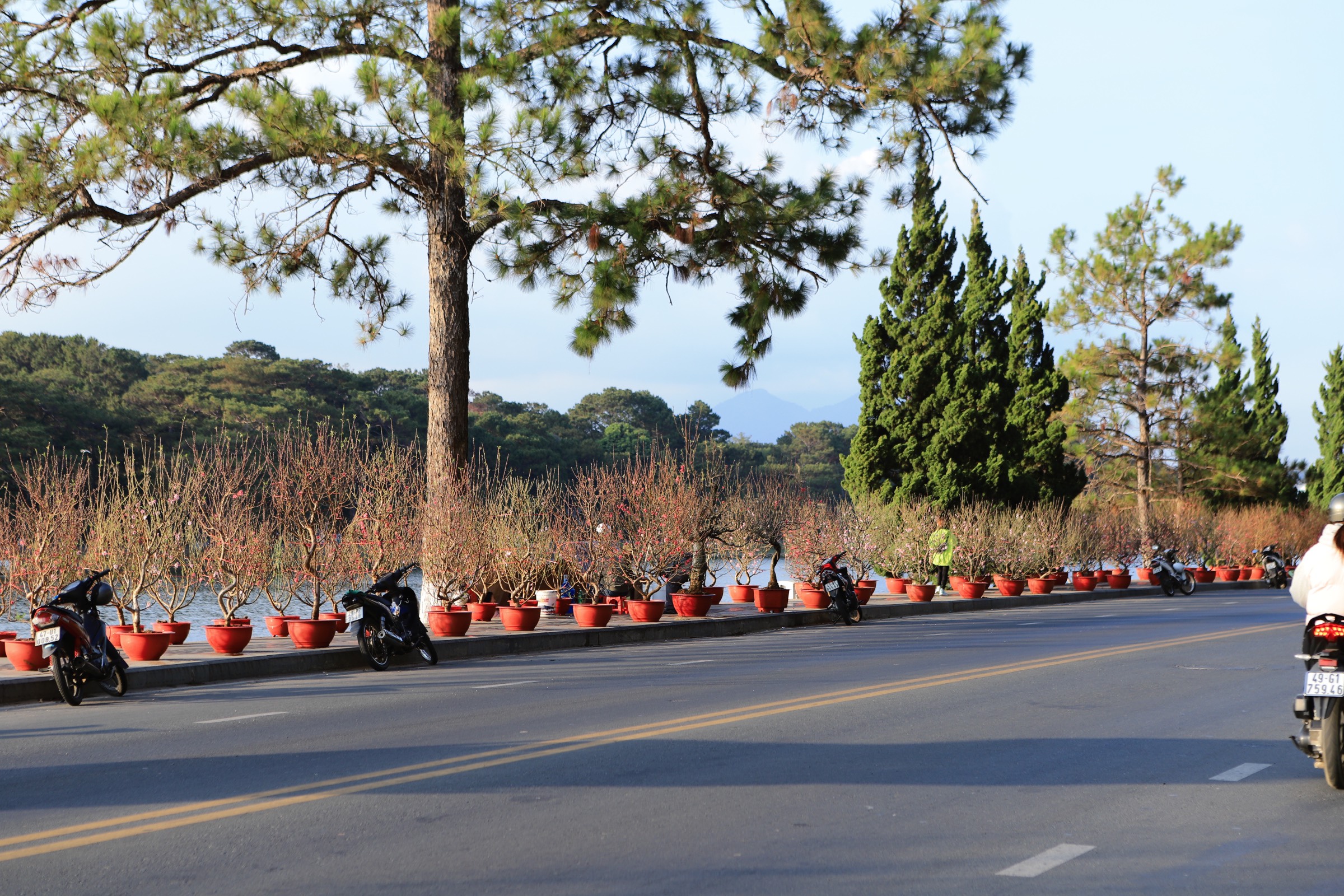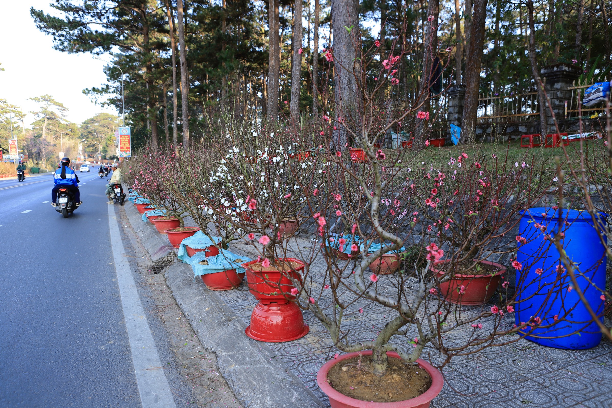 Những chậu đào được bày bán trên đường phố Đà Lạt. Ảnh: Bảo HoàTại gian hàng bán đào của ông Bùi Văn Hải, những chậu đào đã bắt đầu cho ra hoa với màu sắc bắt mắt. Ông Bùi Văn Hải cho biết, còn hơn 1 tuần nữa mới đến Tết Nguyên đán nên thời gian này người bán đào phải tập trung vào việc chăm sóc cây để hoa không bung nở quá nhiều.