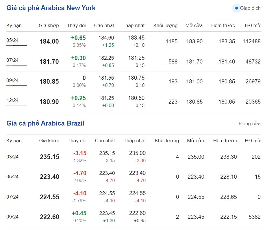 Trong khi đó trên sàn ICE Futures US giá càphê Arabica giao tháng 5.2024 giảm 3,55 cent/lb (giảm 1,90%), xuống mức 183,35 cent/lb; giao tháng 7.2024 giảm 3,10 cent/lb (giảm 1,68%), xuống mức 181,40 cent/lb.