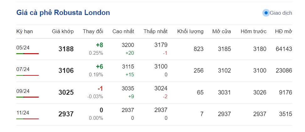 Trên sàn ICE Futures Europe, giá càphê Robusta kỳ hạn giao tháng 5.2024 giảm 9 USD/tấn (giảm 0,28%), xuống mức 3.180 USD/tấn, giao tháng 7.2024 giảm 5 USD/tấn (0,16%), xuống mức 3.100 USD/tấn.