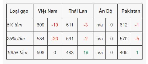 Cùng ngày, giá gạo xuất khẩu của Thái Lan cũng giảm từ 2-3 USD/tấn. Hiện nay, gạo 5% tấm của Thái Lan xuất khẩu với giá 611 USD/tấn (gạo 5% tấm) và 561 USD/tấn (gạo 25% tấm). Riêng gạo 100% tấm của Thái Lan đi trái chiều, tăng 19 USD/tấn.