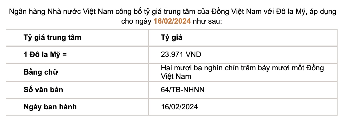 Tỷ giá trung tâm của đồng Việt Nam với đô la Mỹ do Ngân hàng Nhà nước công bố: