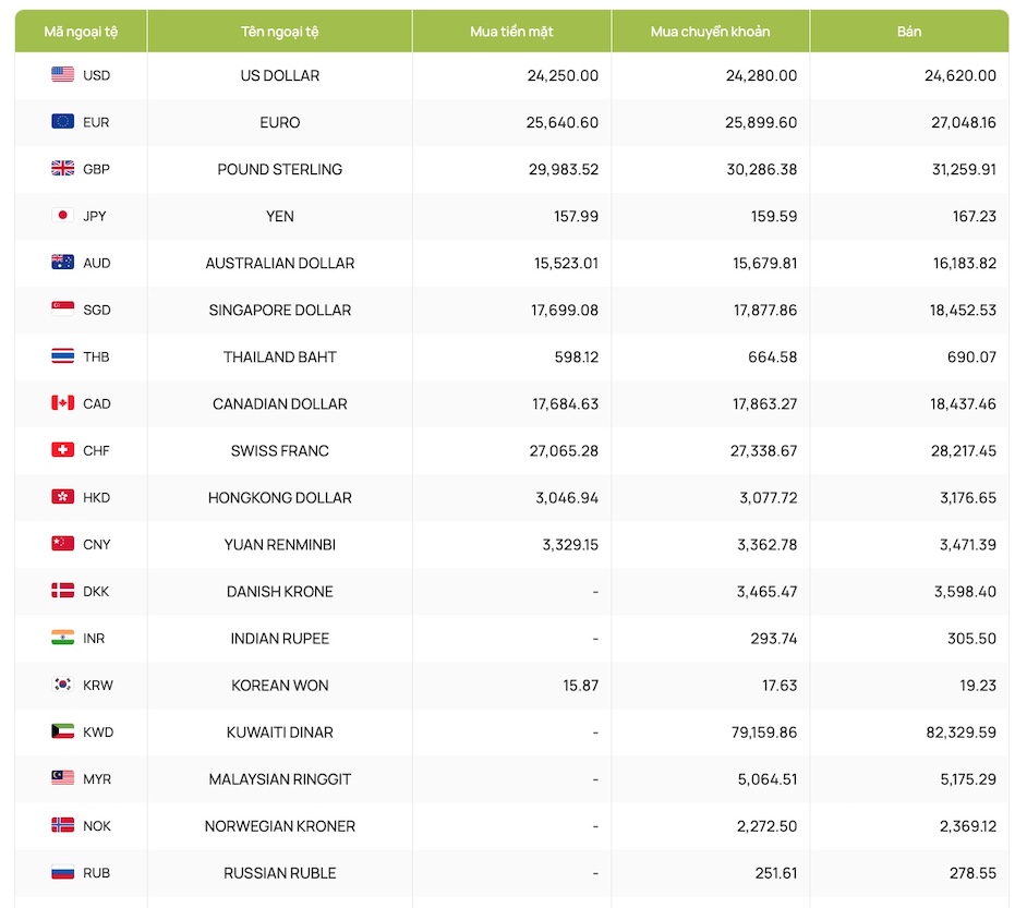 Ngân hàng Vietcombank niêm yết giao dịch mua - bán ở mức 24.250 - 24.620 VND/USD.