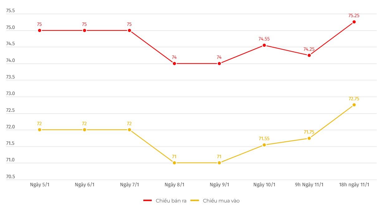 Diễn biến giá vàng trong nước. Đơn vị: Triệu đồng/lượng. Biểu đồ: Khương DuyTrong khi đó, Công ty VBĐQ Sài Gòn SJC niêm yết, giá vàng mua vào 73 triệu đồng/lượng; giá bán ra là 75,5 triệu đồng/lượng. So với mở cửa phiên hôm qua, giá vàng tại Công ty VBĐQ Sài Gòn SJC tăng 1,2 triệu đồng/lượng chiều mua vào và bán ra.
