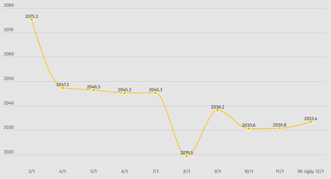 Tính đến 9h45 hôm nay, giá vàng thế giới niêm yết trên Kitco ở mức 2.033,4 USD/ounce, tăng 2,8 USD/ounce so với mở cửa phiên giao dịch sáng qua.