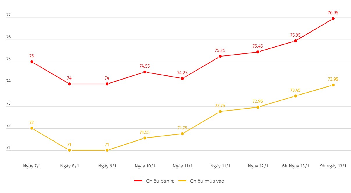 Diễn biến giá vàng trong nước. Đơn vị: Triệu đồng/lượng. Biểu đồ: Khương DuyTrong khi đó, Công ty VBĐQ Sài Gòn SJC niêm yết, giá vàng mua vào 74,5 triệu đồng/lượng; giá bán ra là 77,5 triệu đồng/lượng. So với mở cửa phiên hôm qua, giá vàng tại Công ty VBĐQ Sài Gòn SJC tăng 1,5 triệu đồng/lượng chiều mua vào và tăng 2 triệu đồng/lượng chiều bán ra.