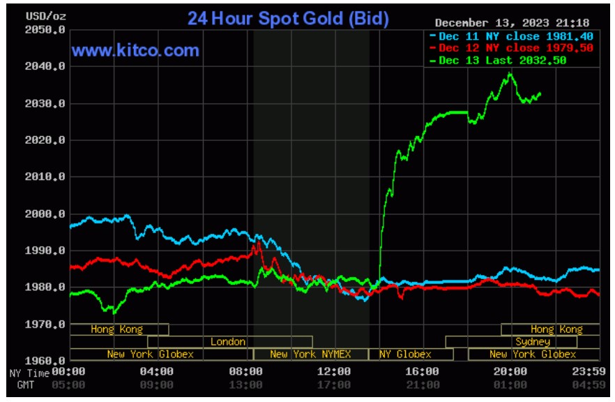 Kim loại quý tăng bứt phá trong bối cảnh Cục Dự trữ liên bang Mỹ (FED) quyết định không nâng lãi suất sau phiên họp chính sách kéo dài 2 ngày. Lãi suất tham chiếu tại Mỹ hiện vào khoảng 5,25-5,5% - vẫn ở vùng giá cao nhất 22 năm. Trong phiên họp tháng 9 và tháng 11, đơn vị này cũng giữ nguyên lãi suất.