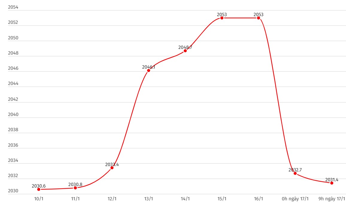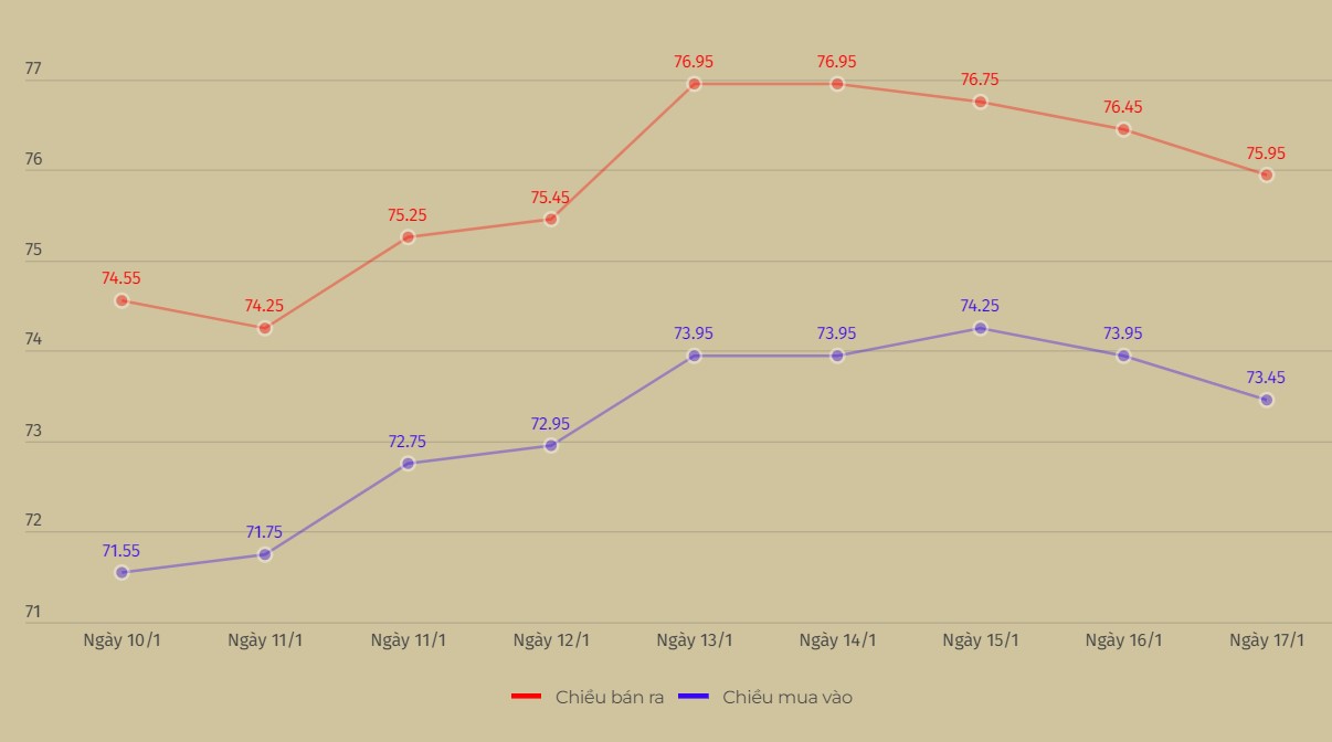 Diễn biến giá vàng trong nước. Đơn vị: Triệu đồng/lượng. Biểu đồ: Khương DuyTrong khi đó, Công ty VBĐQ Sài Gòn SJC niêm yết, giá vàng mua vào 73,5 triệu đồng/lượng; giá bán ra là 76 triệu đồng/lượng. So với mở cửa phiên hôm qua, giá vàng tại Công ty VBĐQ Sài Gòn SJC giảm 300.000 đồng/lượng cả chiều mua vào và bán ra.