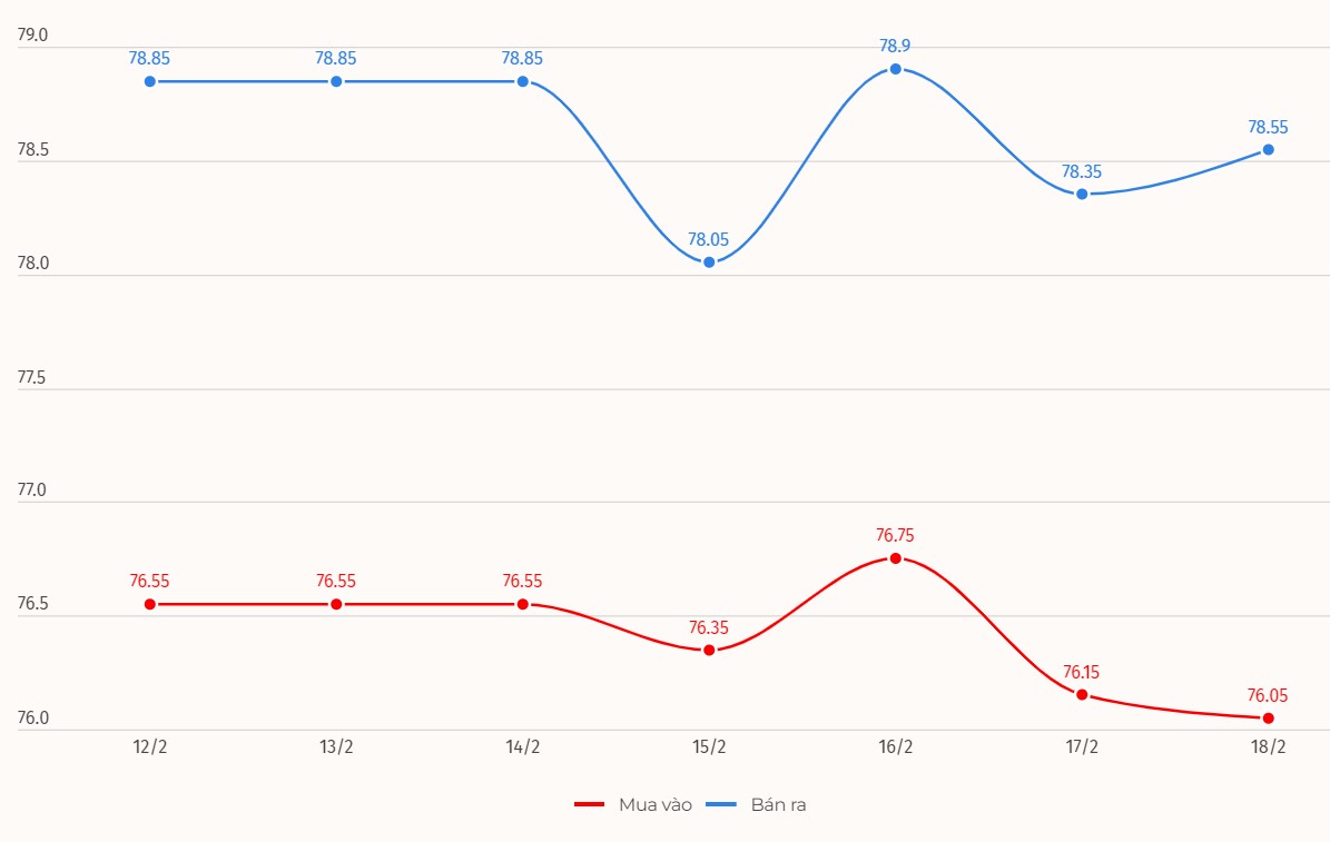 Diễn biến giá vàng trong nước. Đơn vị: Triệu đồng/lượng. Đồ họa: Khương DuyTrong khi đó, Công ty VBĐQ Sài Gòn SJC niêm yết, giá vàng mua vào 76 triệu đồng/lượng; giá bán ra là 78,6 triệu đồng/lượng.