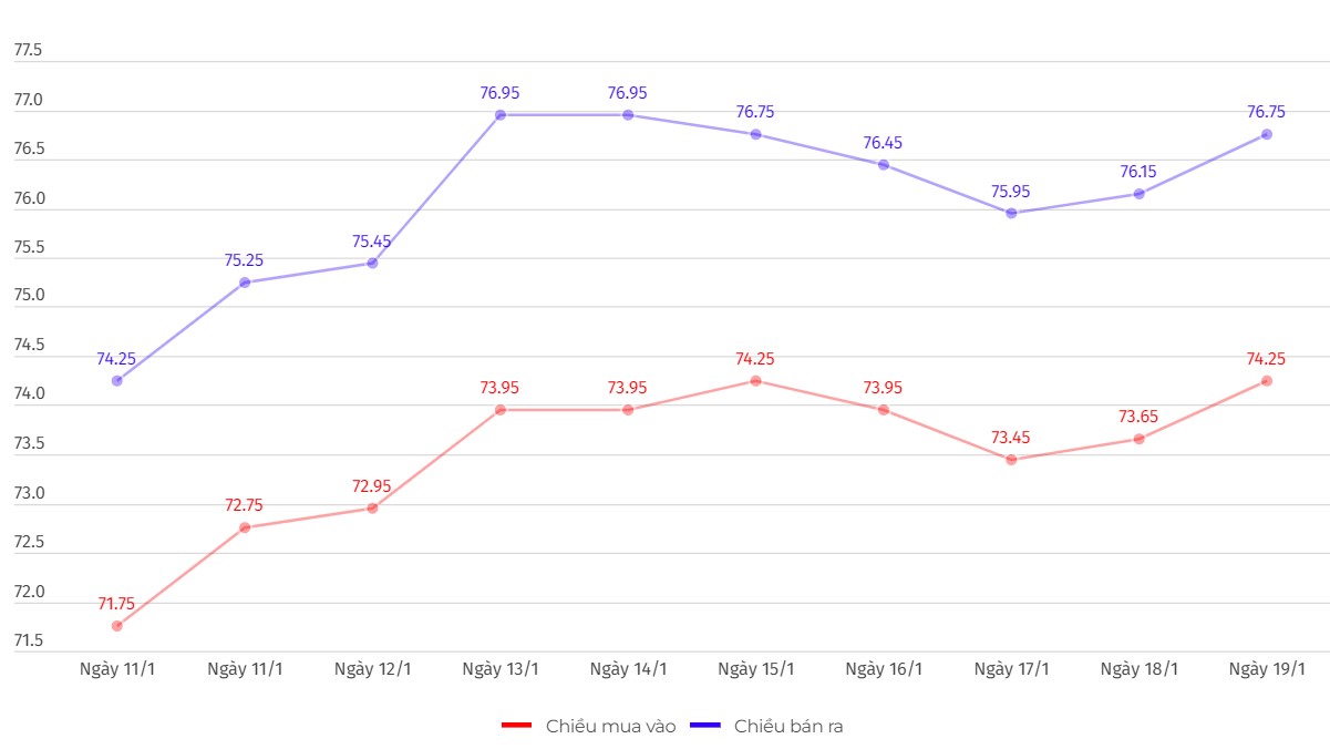 Diễn biến giá vàng trong nước. Đơn vị: Triệu đồng/lượng. Biểu đồ: Khương DuyTrong khi đó, Công ty VBĐQ Sài Gòn SJC niêm yết, giá vàng mua vào 74,3 triệu đồng/lượng; giá bán ra là 76,8 triệu đồng/lượng. So với mở cửa phiên hôm qua, giá vàng tại Công ty VBĐQ Sài Gòn SJC cùng tăng 800.000 đồng/lượng chiều mua vào và bán ra.