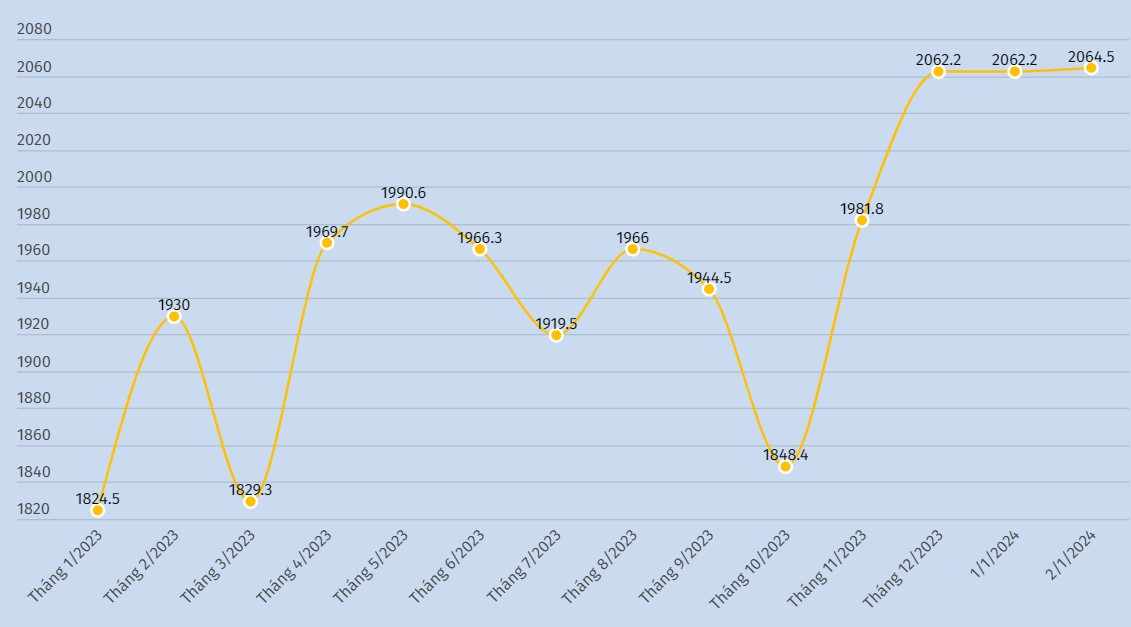 Tính đến 9h hôm nay, niêm yết trên Kitco ở mức 2.064,5 USD/ounce. Kim loại quý trên thị trường thế giới tăng nhẹ trong phiên đầu tiên mở cửa trở lại sau kỳ nghỉ lễ đón năm mới.