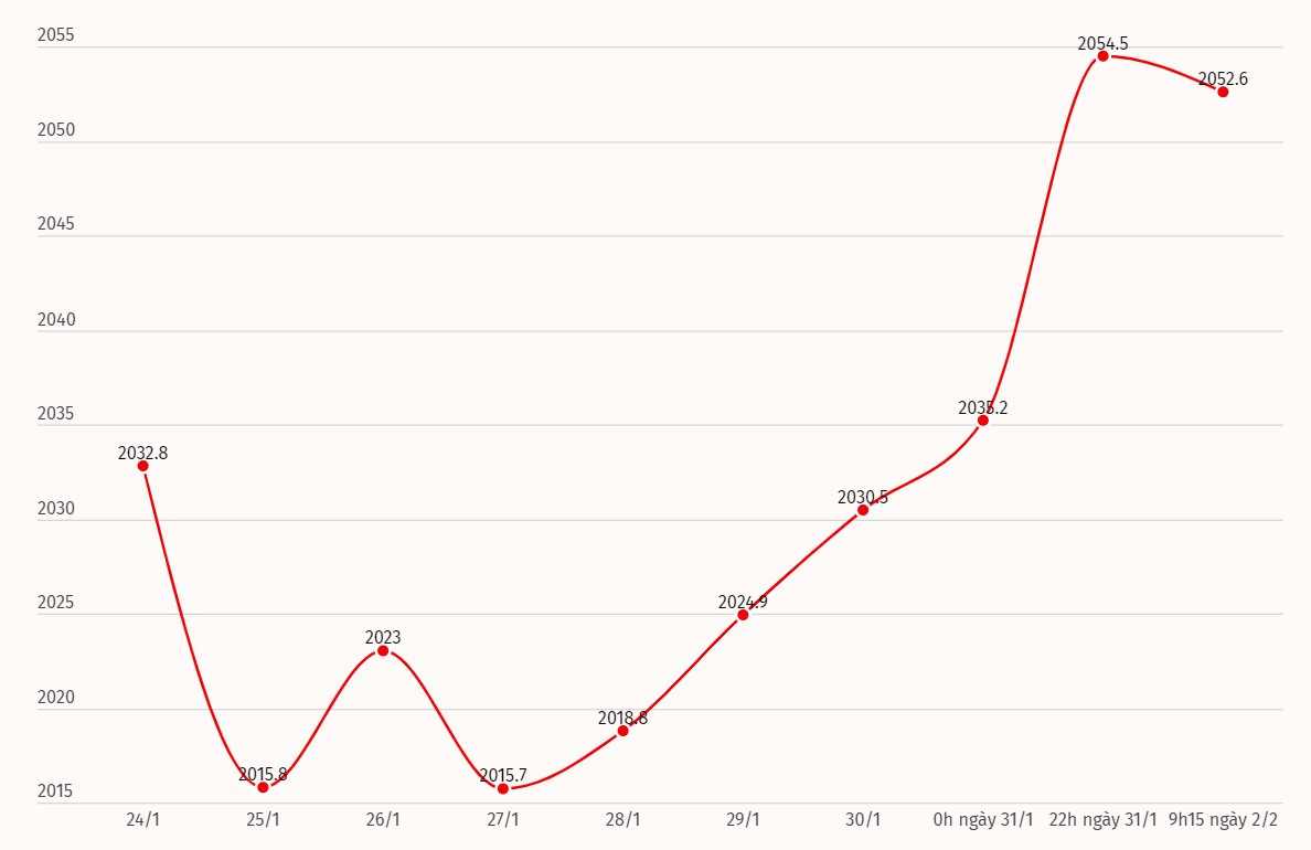 Diễn biến giá vàng thế giới tuần qua. Đơn vị: Triệu đồng/lượng. Đồ họa: Khương DuyGiá vàng thế giới mở cửa phiên giao dịch sáng nay niêm yết trên Kitco ở ngưỡng 2.052,6 USD/ounce, giảm 1,9 USD/ounce so với mở cửa phiên giao dịch trước.