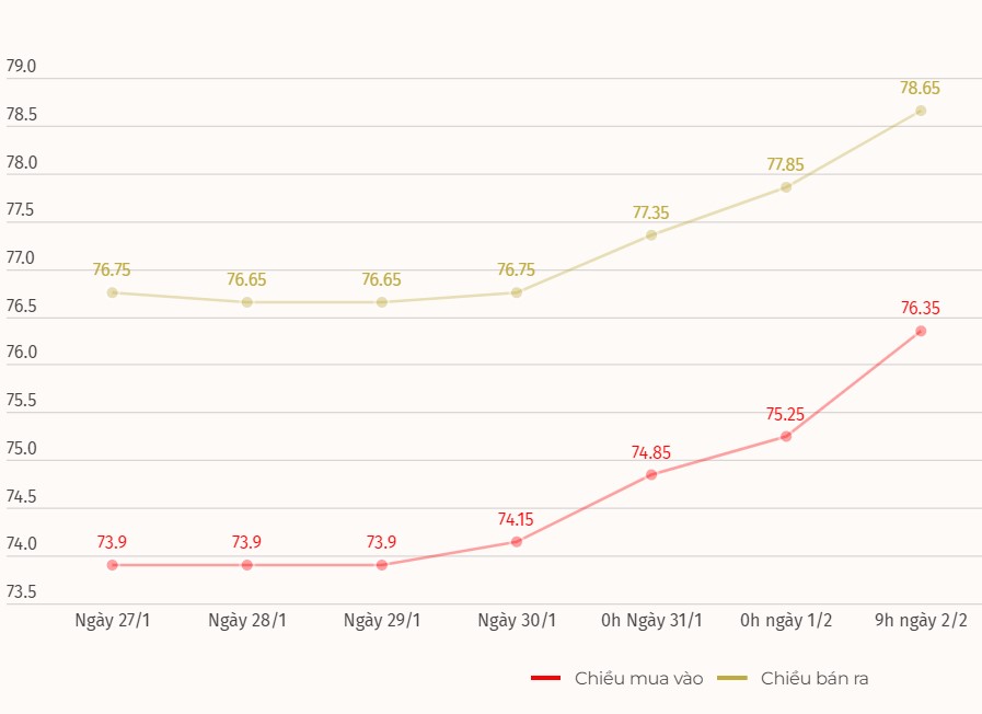 Diễn biến giá vàng trong nước tuần qua. Đơn vị: Triệu đồng/lượng. Đồ họa: Khương DuyTrong khi đó, Công ty VBĐQ Sài Gòn SJC niêm yết, giá vàng mua vào 76,4 triệu đồng/lượng; giá bán ra là 78,7 triệu đồng/lượng. Chênh lệch giá mua - bán vàng SJC ở mức 2,3 triệu đồng/lượng.