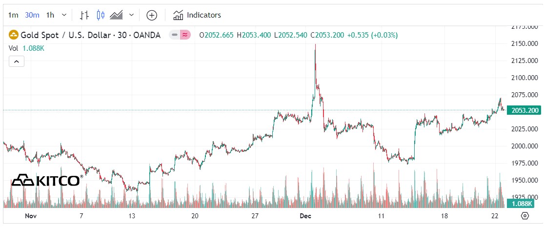 Diễn biến vàng thế giới. Nguồn: KitcoGiá vàng thế giới đầu giờ sáng nay niêm yết trên Kitco ở mức 2.053,2 USD/ounce, tăng nhẹ với mở cửa phiên giao dịch trước.