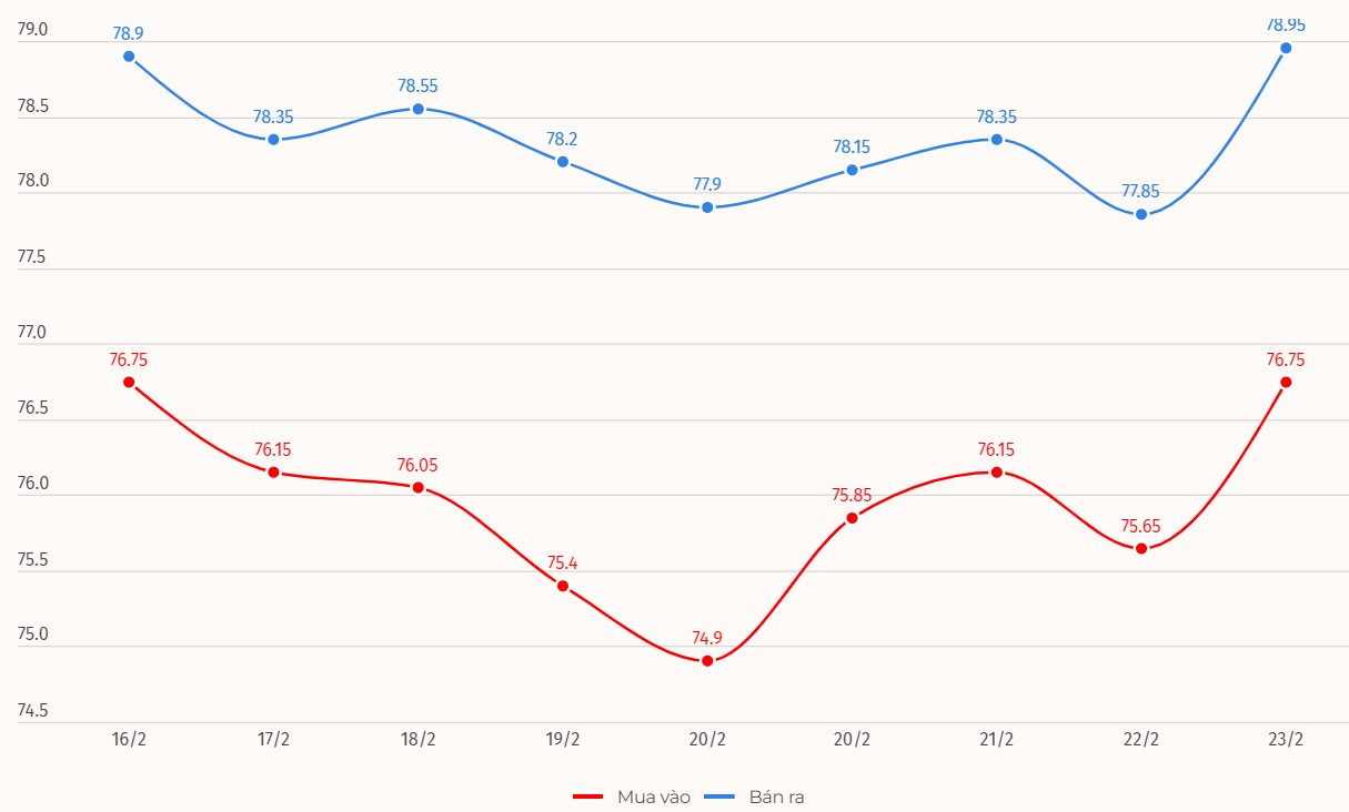 Diễn biến giá vàng trong nước. Đơn vị: Triệu đồng/lượng. Đồ họa: Lệ HàTrong khi đó, Bảo Tín Minh Châu niêm yết, giá vàng mua vào 76,8 triệu đồng/lượng; giá bán ra là 79 triệu đồng/lượng.