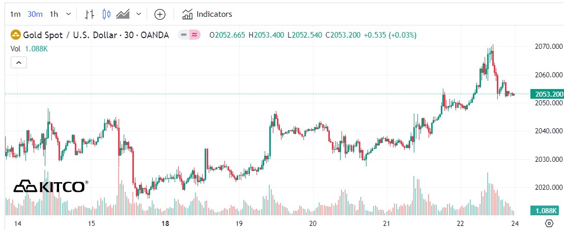 Diễn biến giá vàng thế giới. Nguồn: KitcoGiá vàng thế giới chốt phiên giao dịch tuần được niêm yết trên Kitco ở ngưỡng 2.053,2 USD/ounce, đã tăng 33,7 USD/ounce so với đóng cửa phiên giao dịch tuần trước.
