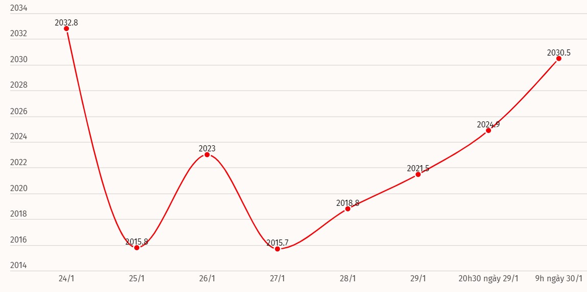 Diễn biến giá vàng thế giới tuần qua. Đơn vị: Triệu đồng/lượng. Đồ họa: Khương DuyGiá vàng thế giới mở cửa phiên giao dịch sáng nay niêm yết trên Kitco ở ngưỡng 2.030 USD/ounce, tăng 8,5 USD/ounce so với mở cửa phiên giao dịch trước.