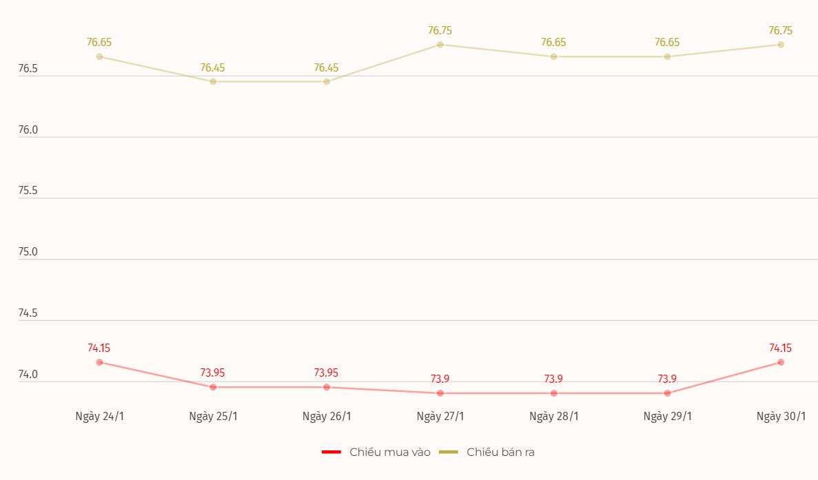 Diễn biến giá vàng trong nước tuần qua. Đơn vị: Triệu đồng/lượng. Đồ họa: Khương DuyTrong khi đó, Công ty VBĐQ Sài Gòn SJC niêm yết, giá vàng mua vào 74,3 triệu đồng/lượng; giá bán ra là 76,8 triệu đồng/lượng.