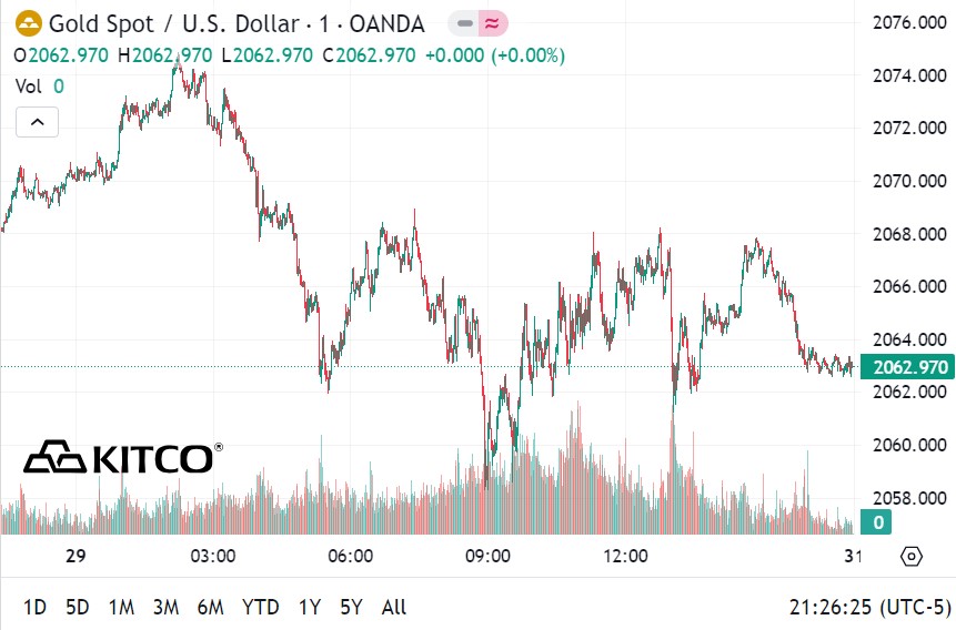 Tính đến 9h hôm nay, niêm yết trên Kitco ở mức 2.062,9 USD/ounce. So với mở cửa phiên giao dịch trước, giá vàng thế giới giảm 7,9 USD/ounce.