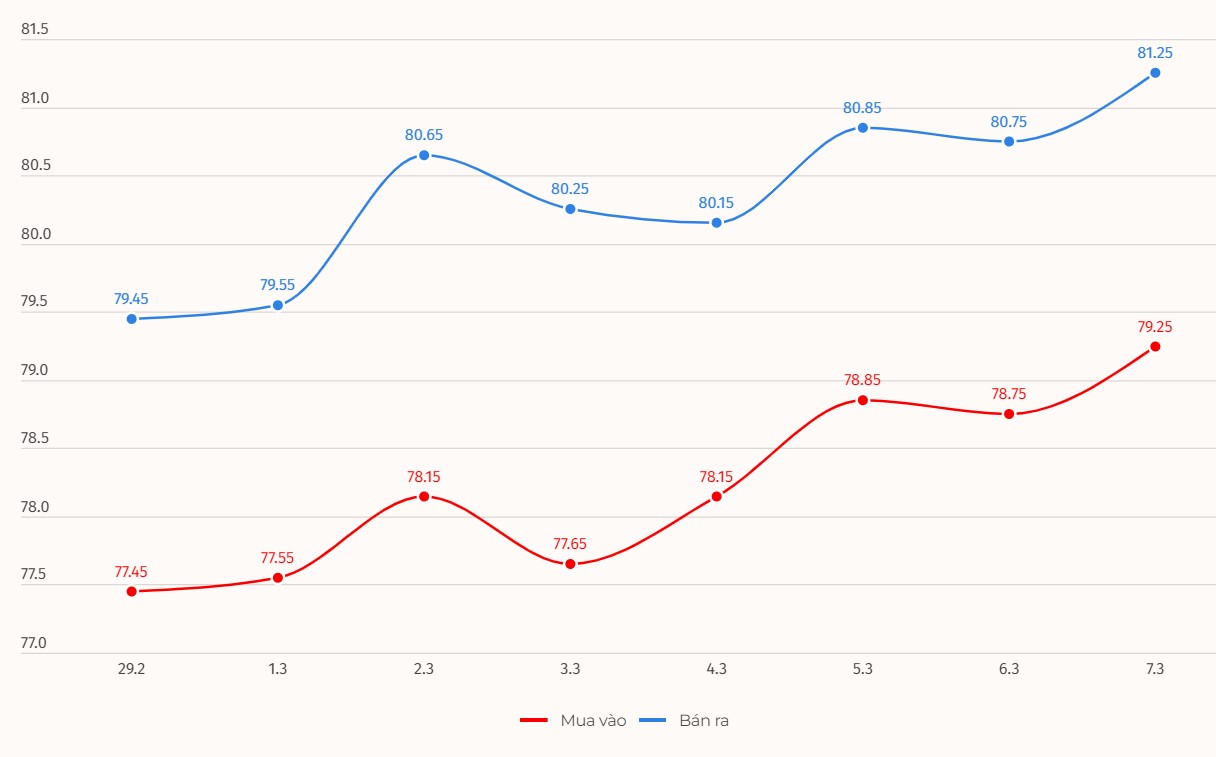 Diễn biến giá vàng trong nước. Đơn vị: Triệu đồng/lượng. Biểu đồ: Khương DuyTrong khi đó, tại Bảo Tín Minh Châu, giá vàng SJC niêm yết ở ngưỡng 79,35-81,25 triệu đồng/lượng (mua vào - bán ra). Chênh lệch giá mua - bán vàng SJC ở mức 1,9 triệu đồng/lượng.