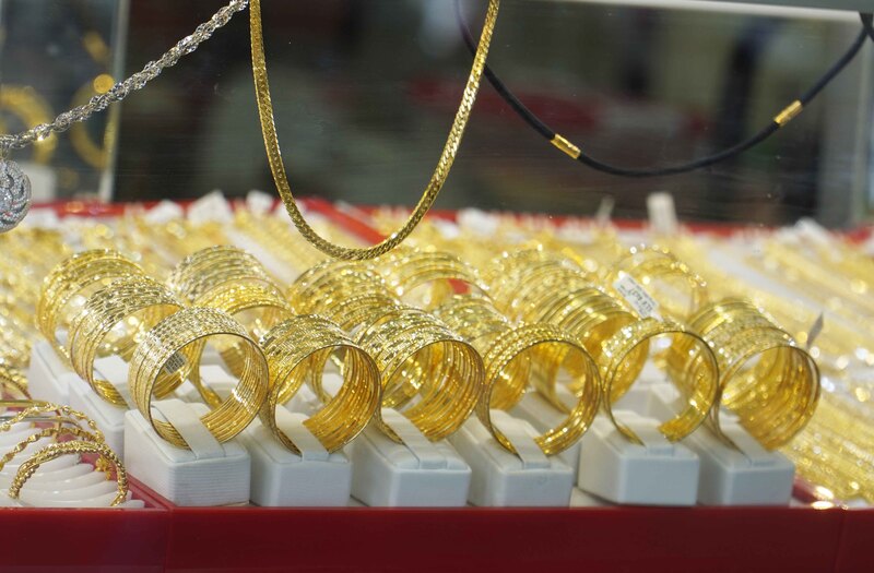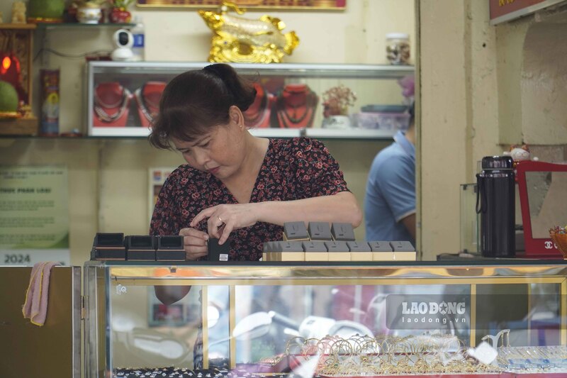 Một chủ tiệm vàng đang sắp xếp lại các mặt hàng để phục vụ khách.