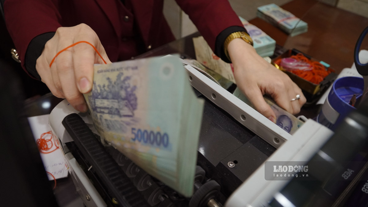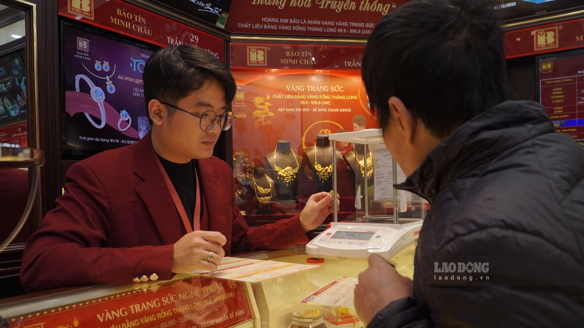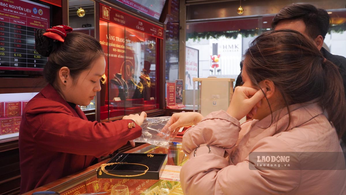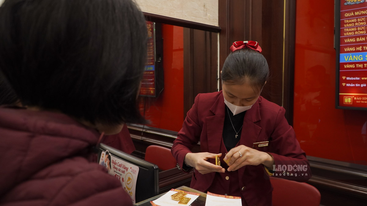 Nhân viên vẫn phải liên tục kiểm đếm vàng, làm việc thông trưa để phục vụ khách hàng đến giao dịch.
