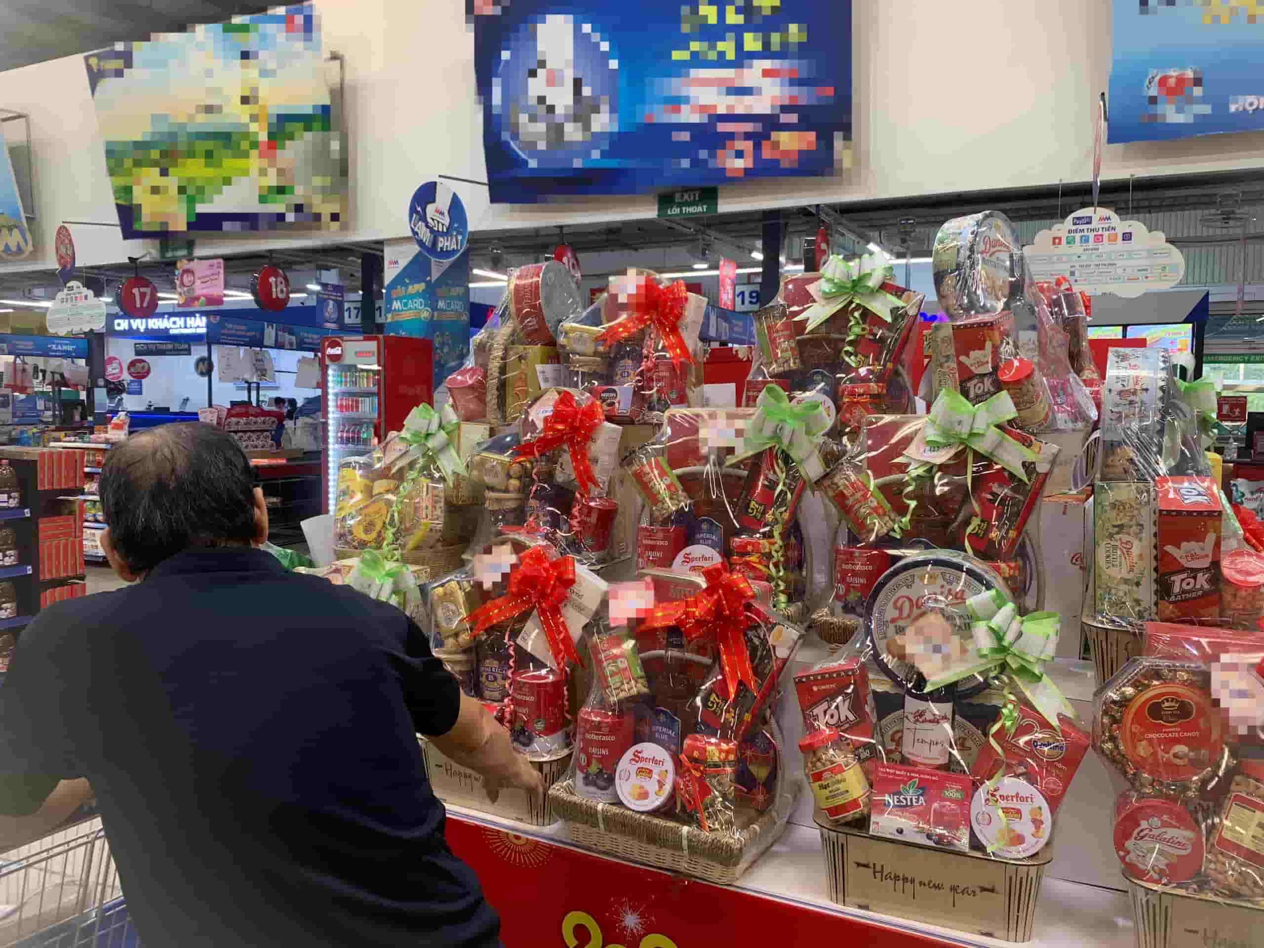 Theo ghi nhận của PV Lao Động, tại một siêu thị ở quận Cầu Giấy, Hà Nội đã trưng bày nhiều loại quà tặng Tết ở lối vào siêu thị nhằm thu hút khách hàng.