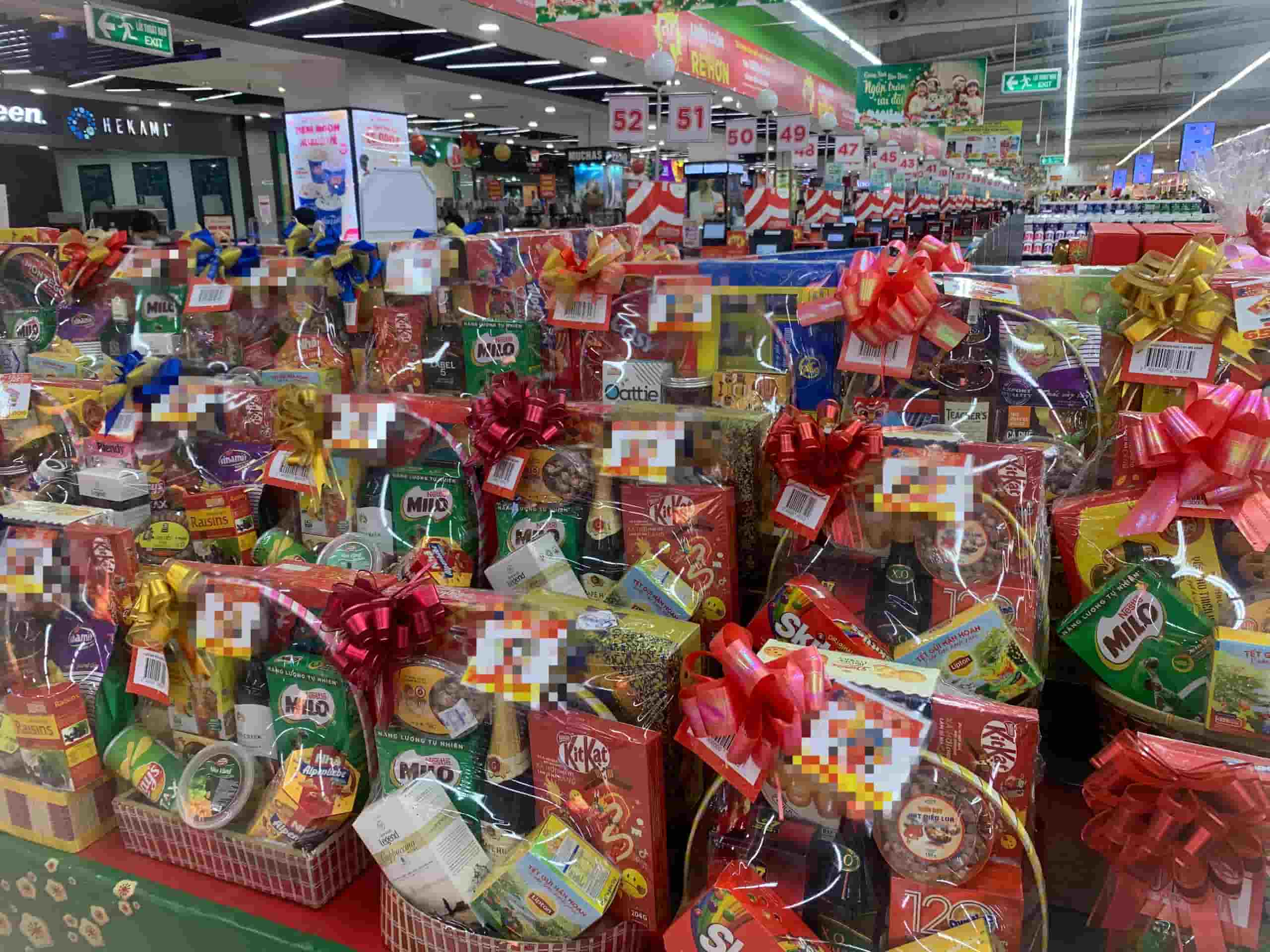 Nhiều mặt hàng quà tặng Tết Nguyên đán đã bắt đầu lên kệ nhằm thu hút khách hàng. Ảnh: Nhật MinhMức giá của những giỏ hàng quà tặng Tết dao động từ 200.000 đồng đến 3 triệu đồng tùy vào nhu cầu mua sắm của khách hàng.