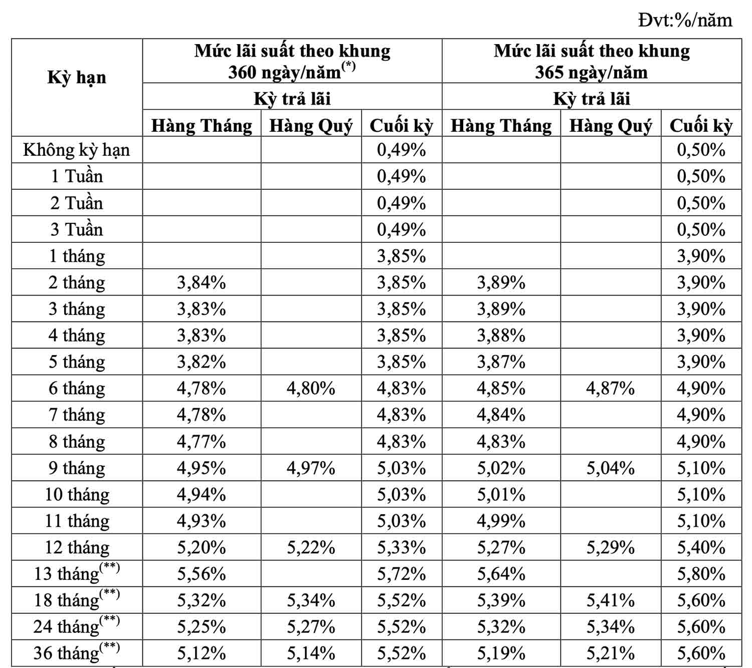 Các kỳ hạn 18-24-36 tháng sẽ được áp dụng mức lãi suất 5,6%/năm. Đặc biệt, nếu khách hàng gửi kỳ hạn từ 13 tháng trở lên lãi cuối kỳ với khoản tiền gửi từ 200 tỉ đồng trở lên: Áp dụng mức lãi suất là 7,5%/năm cho khung 365 ngày/năm và 7,4%/năm cho khung 360 ngày/năm.