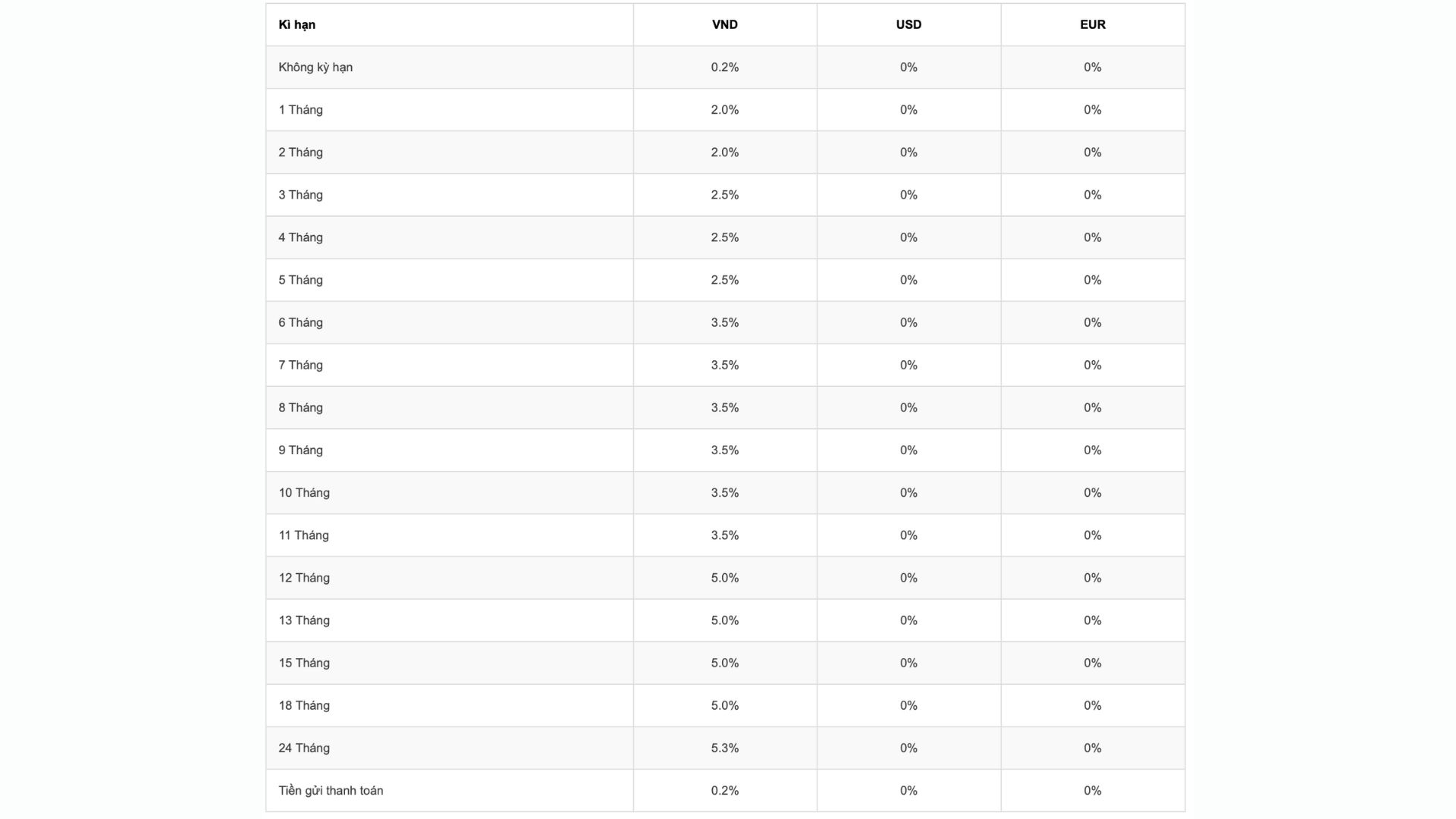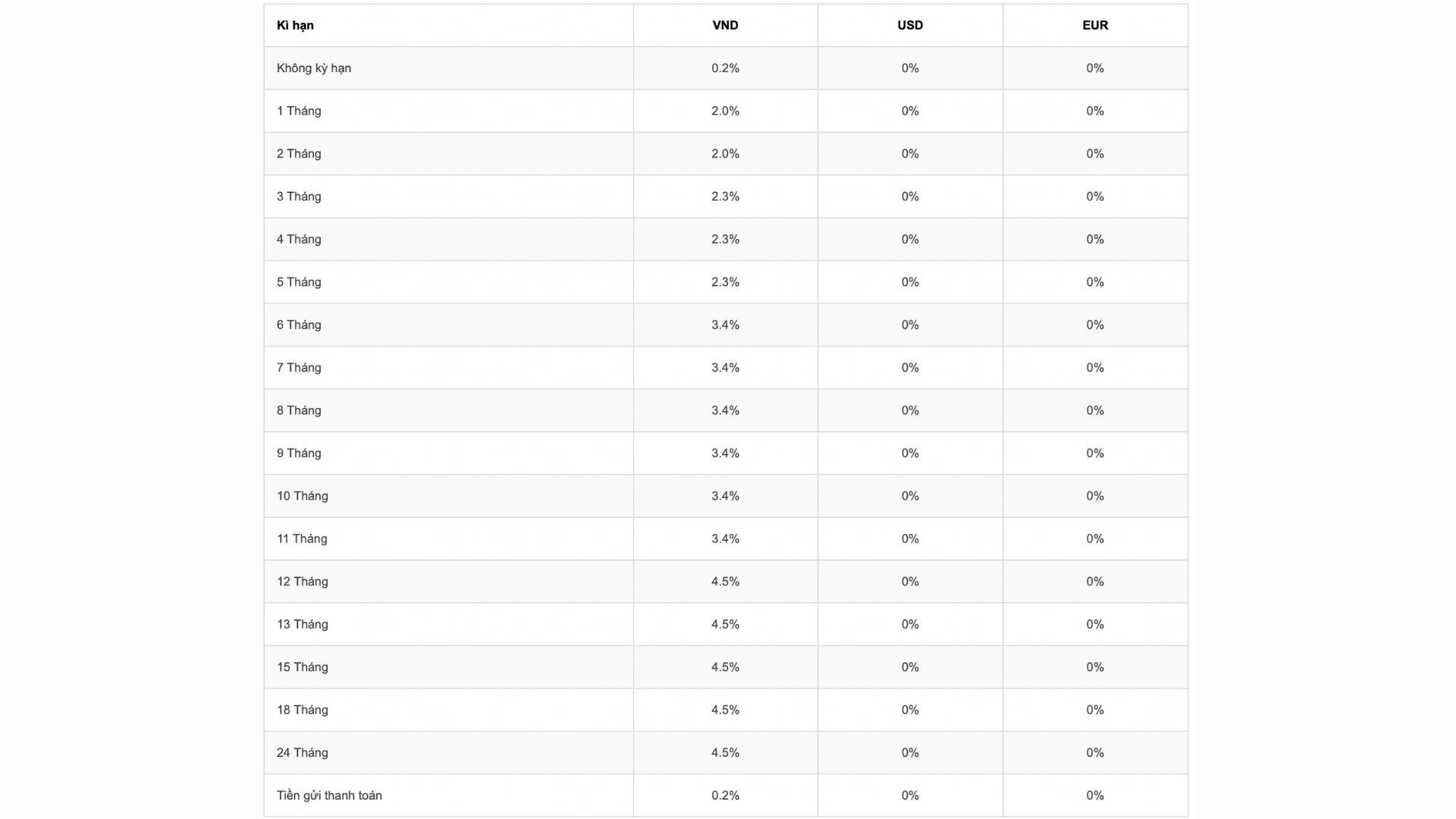 Lãi suất tiền gửi tại các kỳ hạn 6 - 11 tháng là 3,4%/năm. Mức lãi suất cao nhất 4,5%/năm được áp dụng cho các kỳ hạn từ 12 - 24 tháng. Các khoản tiền gửi không kỳ hạn và tiền gửi thanh toán sẽ được niêm yết lãi suất thấp ở mức 0,2%/năm.