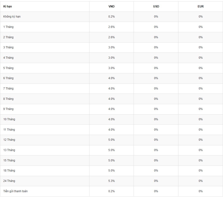 Khách hàng gửi tiền không kỳ hạn và tiền gửi thanh toán sẽ nhận lãi suất ở mức 0,2%/năm.