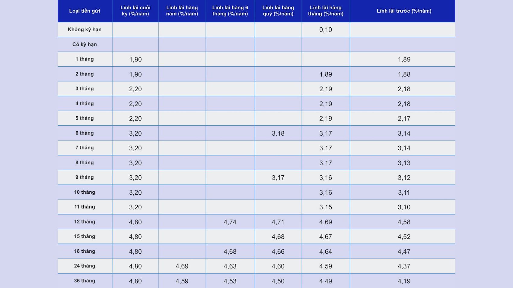 Thông tin về lãi suất chỉ mang tính chất tham khảo và có thể thay đổi trong từng thời kỳ. Vui lòng liên hệ điểm giao dịch ngân hàng gần nhất hoặc hotline để được tư vấn cụ thể.