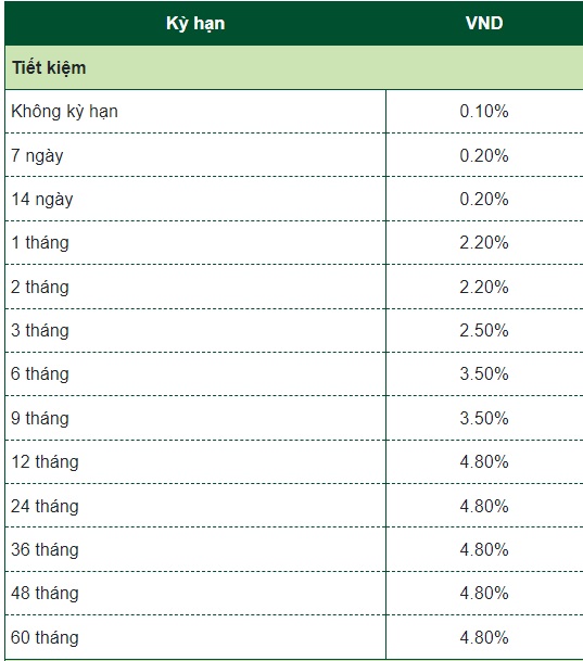 Ngoài ra, tại kỳ hạn 1 hoặc 2 tháng, Agribank niêm yết lãi suất ở mức 2,2%/năm. Tại các kỳ hạn 3, Vietcombank niêm yết lãi suất ở mức là 2,5%/năm. Lãi suất tiết kiệm tại Vietcombank các kỳ hạn từ 6 - 9 tháng ở mức 3,5%/năm. Khách hàng gửi tiền từ 12 - 60 tháng nhận lãi suất cao nhất 4,8%/năm.