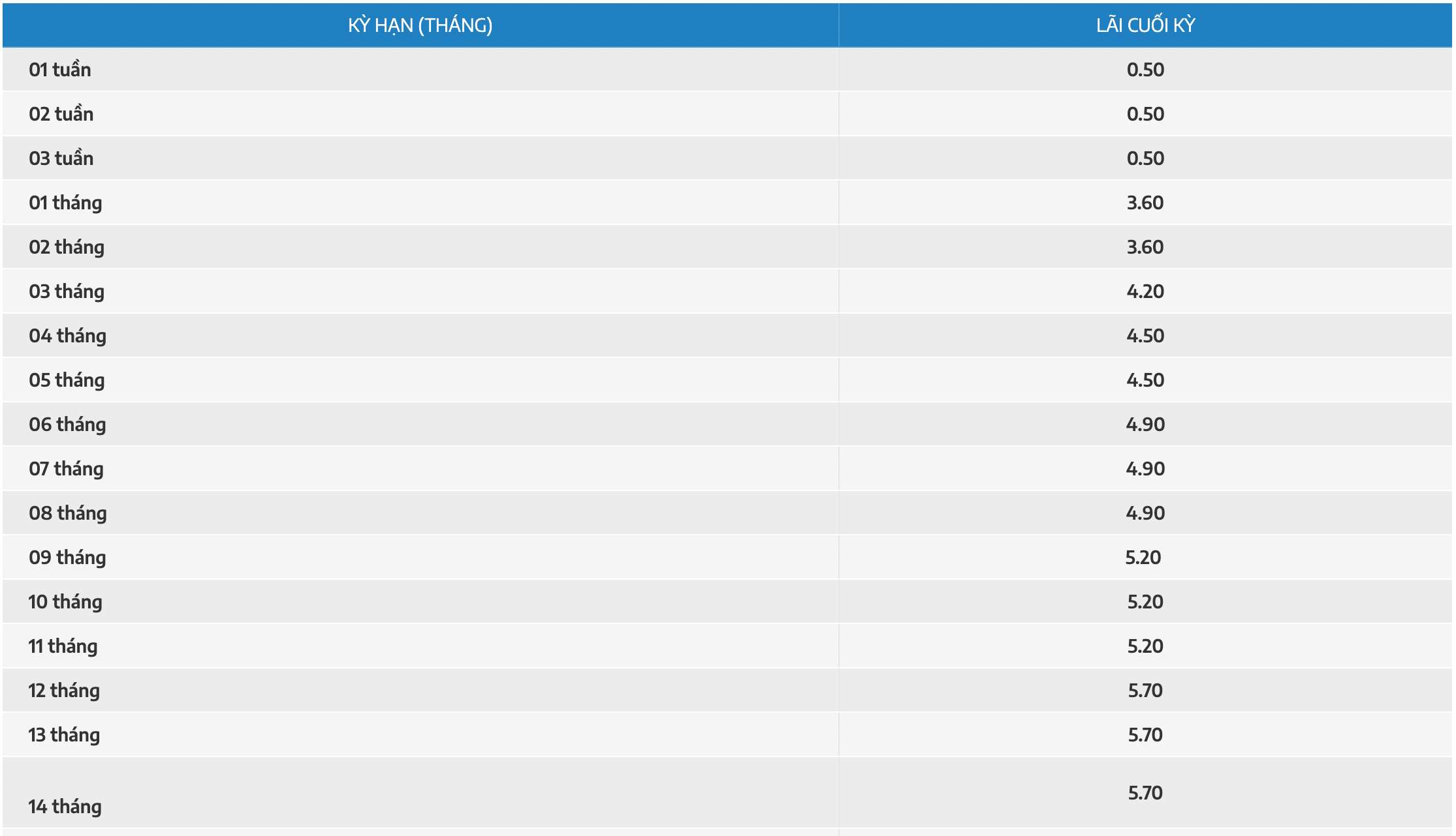 Biểu lãi suất tiết kiệm VRB. Ảnh chụp màn hìnhNCB đang niêm yết lãi suất tiết kiệm cao nhất kỳ hạn 12 tháng ở mức 5,7%/năm khi khách hàng gửi tiền An Phú. Khách hàng gửi tiền truyền thống chỉ nhận lãi suất cao nhất 5,55%/năm.