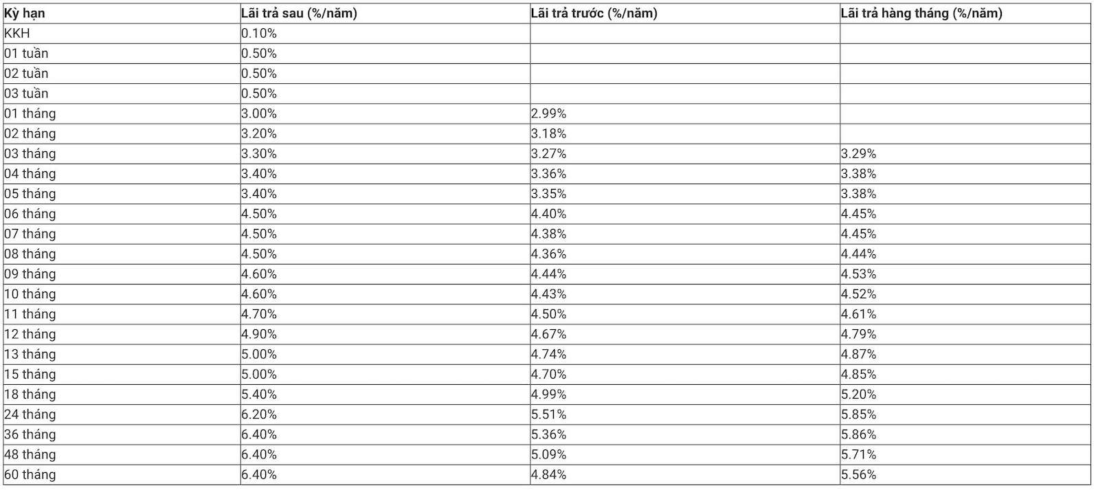 Khách hàng gửi tiết kiệm 36 - 60 tháng nhận lãi suất cao nhất ở mức 6,4%/năm. Khách hàng gửi tiền không kỳ hạn chỉ nhận lãi suất ở mức 0,1%/năm.