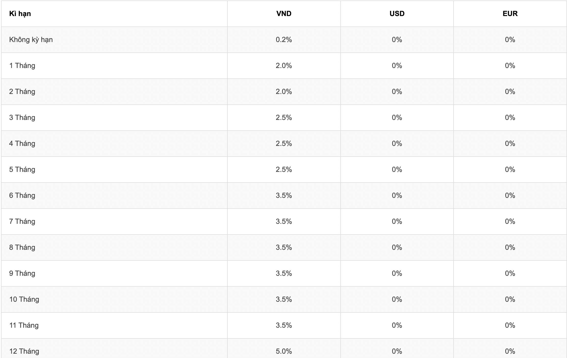 Khách hàng gửi tiền không kỳ hạn và tiền gửi thanh toán sẽ nhận lãi suất ở mức 0,2%/năm.