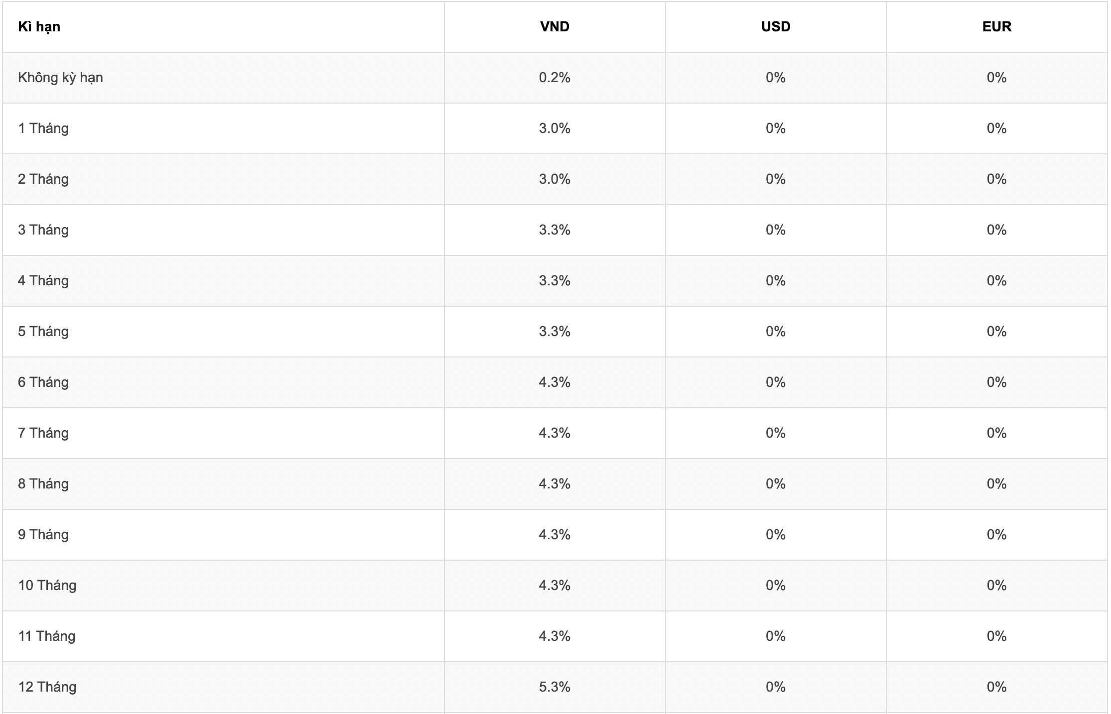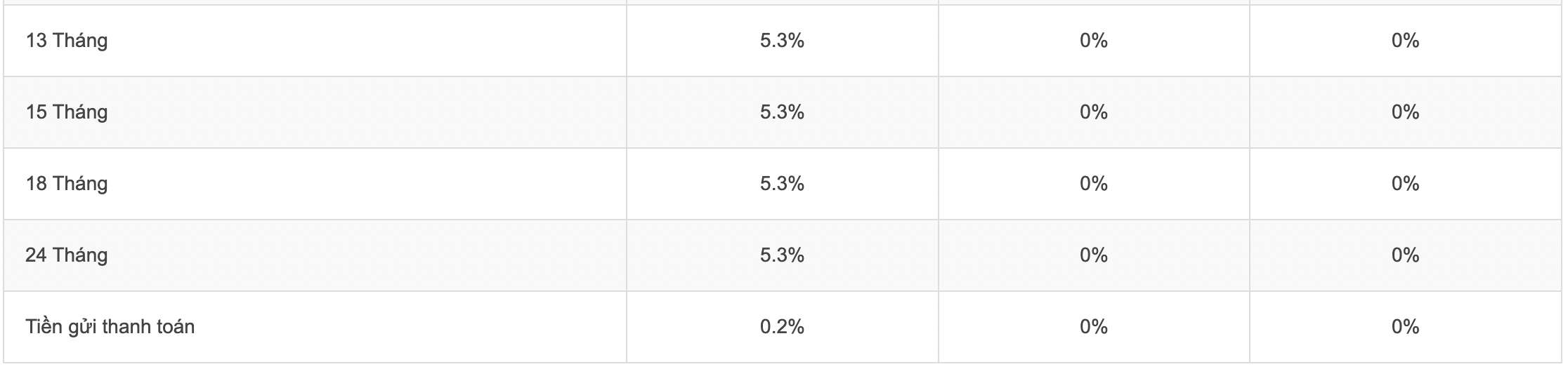 Agribank và BIDV niêm yết lãi suất tại kỳ hạn 1 tháng, 2 tháng ở mức 3%/năm. Tại các kỳ hạn 3 - 5 tháng, Agribank và BIDV niêm yết lãi suất ở mức là 3,3%/năm.