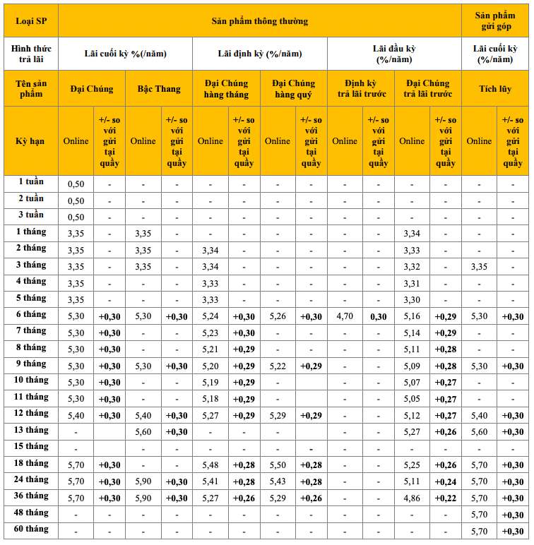 * Thông tin về lãi suất chỉ mang tính chất tham khảo và có thể thay đổi trong từng thời kỳ. Vui lòng liên hệ điểm giao dịch ngân hàng gần nhất hoặc hotline để được tư vấn cụ thể.