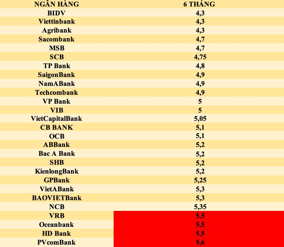 Biểu lãi suất tiết kiệm VRB. Ảnh chụp màn hìnhDưới đây là bảng thống kê lãi suất tiết kiệm kỳ hạn 6 tháng của gần 30 ngân hàng trong hệ thống: