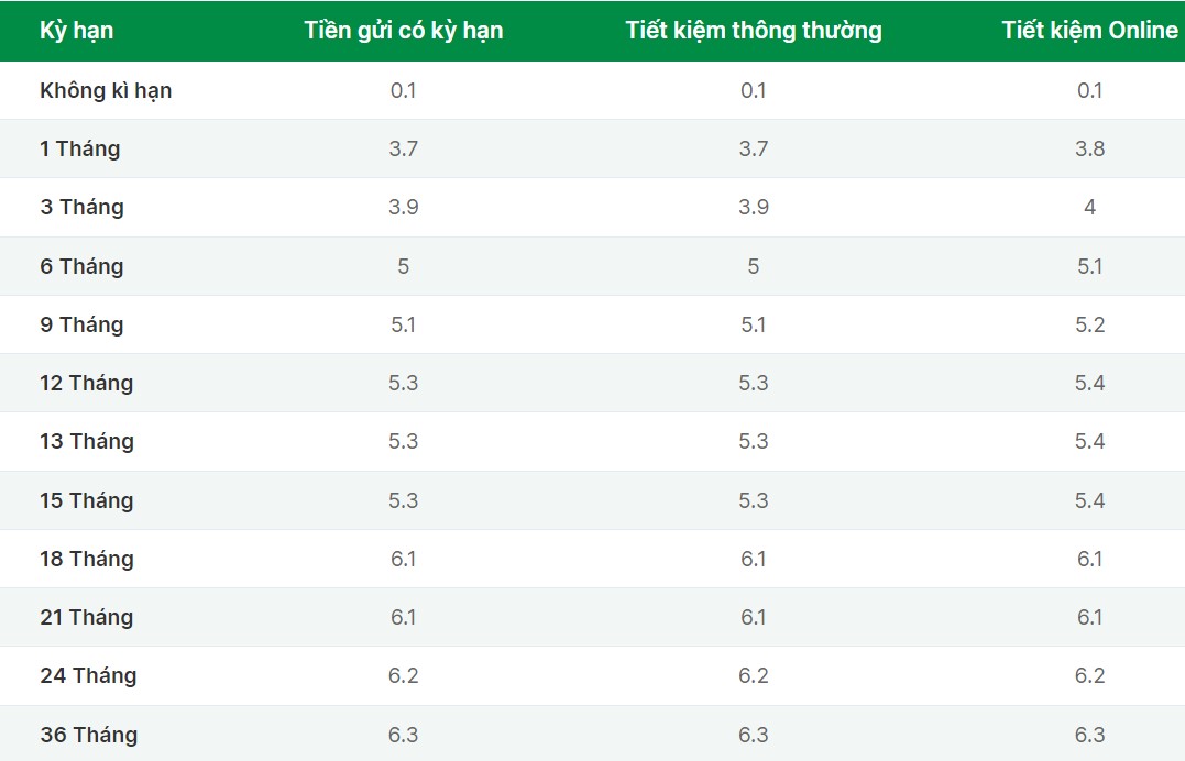 Lãi suất OCB cao hơn, ở ngưỡng 3,7-6,3%/năm. Cụ thể, ngân hàng này niêm yết lãi suất không kỳ hạn ở ngưỡng 0,1%/năm; 1 tháng ở ngưỡng 3,7%/năm; 3 tháng ở ngưỡng 3,9%/năm; 6 tháng ở ngưỡng 5%/năm; 9 tháng ở ngưỡng 5,1%/năm; các kỳ hạn từ 12 đến 15 tháng ở ngưỡng 5,3%/năm; 36 tháng ở ngưỡng 6,3%/năm.