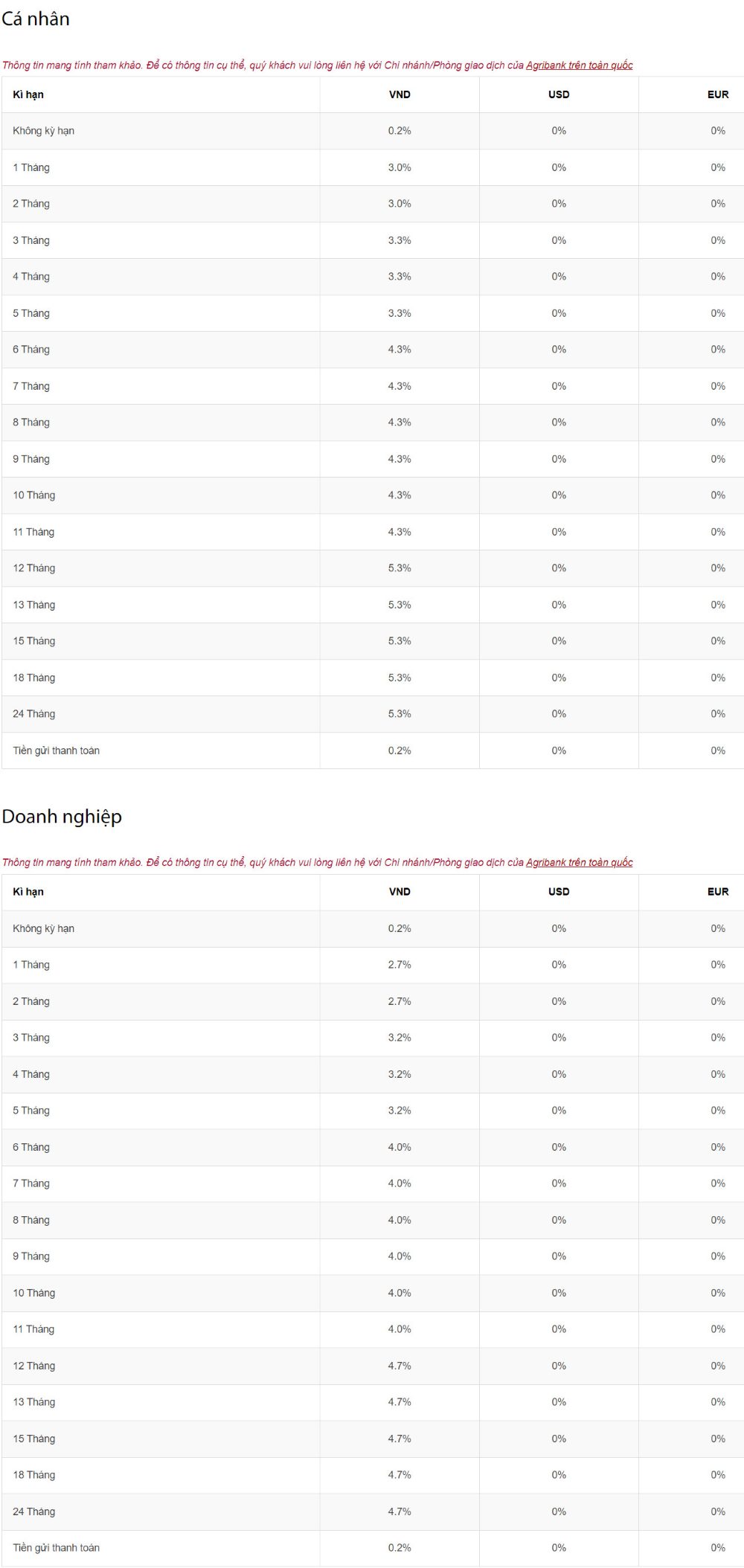 Trong đó, Agribank niêm yết lãi suất quanh ngưỡng 3-5,3%/năm. Ngân hàng này niêm yết lãi suất không kỳ hạn ở ngưỡng 0,2%/năm; 1-2 tháng ở ngưỡng 3%/năm; 3-4-5 tháng ở ngưỡng 3,3%/năm; 6-7-8-9-10-11 tháng ở ngưỡng 4,3%/năm; các kỳ hạn từ 12 đến 24 tháng ở ngưỡng 5,3%/năm.