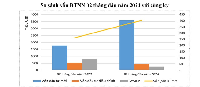 2 tháng đầu năm, ngoài vốn đầu tư điều chỉnh và góp vốn, mua cổ phần giảm thì vốn đầu tư đăng ký mới vẫn tăng mạnh cả về số dự án lẫn tổng vốn đăng ký. Nguyên nhân được lý giải bởi tăng số lượng dự án mới (tăng 55,2%) và có dự án có quy mô vốn đầu tư lớn (hơn 400 triệu USD và hơn 600 triệu USD).