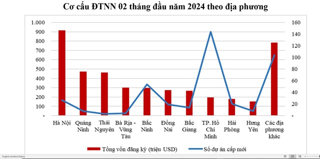 2 tháng đầu năm, có 405 dự án mới được cấp giấy chứng nhận đăng ký đầu tư (tăng 55,2% so với cùng kỳ); tổng vốn đăng ký đạt gần 3,6 tỉ USD (gấp hơn 2 lần so với cùng kỳ).