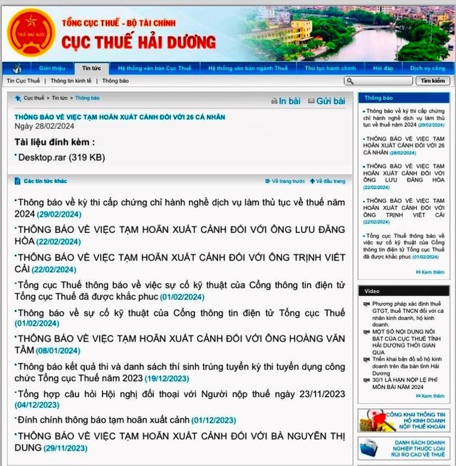 Nhiều chủ doanh nghiệp nợ đọng thuế bị Cục Thuế tỉnh Hải Dương đăng công khai việc tạm hoãn xuất cảnh
