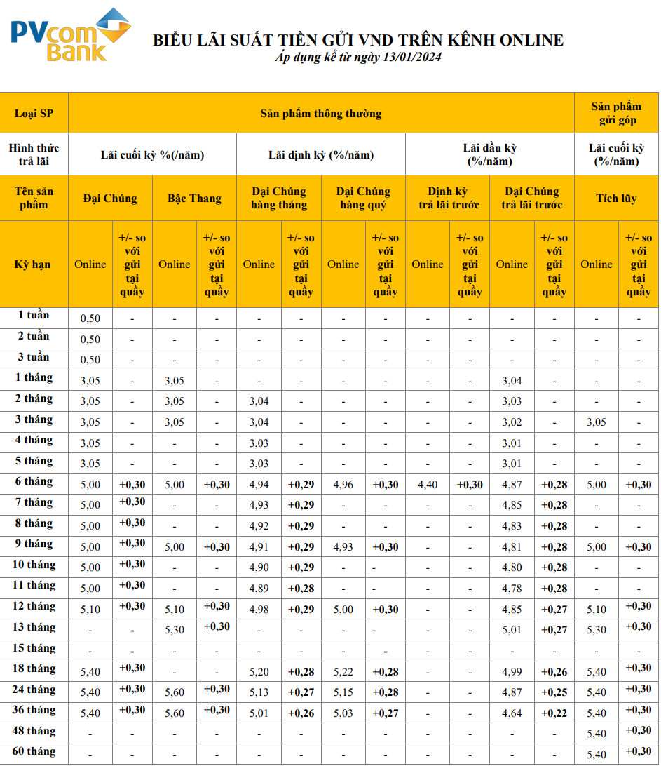 Cũng tại ngân hàng này, khi gửi tại quầy, lãi suất tiết kiệm kỳ hạn từ 1 - 60 tháng dao động từ 3,05 - 5,30%/năm. Còn khi gửi online sẽ nhận lãi suất cao hơn là 5,60%/năm với kỳ hạn 36 tháng. Tại kỳ hạn ngắn từ 1 - 3 tuần, khách hàng gửi tiền sẽ nhận lãi suất 0,50%/năm.