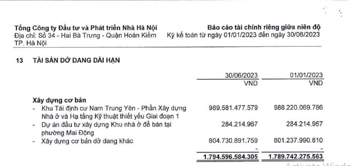 Bên cạnh đó, Handico cũng ghi nhận tài sản dở dang dài hạn gần 1.795 tỉ đồng. Bao gồm xây dựng cơ bản tại Khu tái định cư Nam Trung Yên - Phần xây dựng Nhà ở và Hạ tầng Kỹ thuật thiết yếu giai đoạn 1 gần 1.000 tỉ đồng; dự án đầu tư xây dựng Khu nhà ở để bán tại phường Mai Động gần 300 triệu đồng và xây dựng cơ bản dở dang khác hơn 800 tỉ đồng.