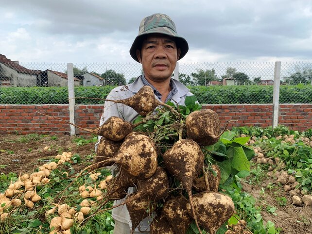 Ven đường, nông dân dùng xe rùa chở củ đậu mới thu hoạch trong ruộng ra tập kết để bán lẻ nhằm vớt vát thiệt hại.