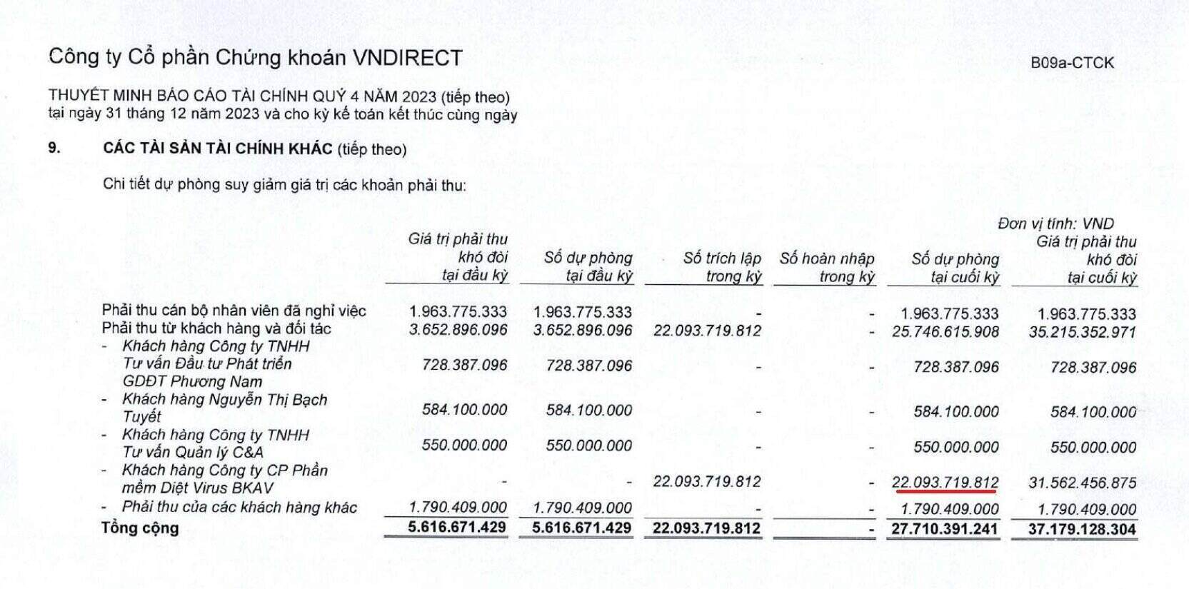 VIDIRECT đã trích lập dự phòng hơn 22 tỉ đồng đối với khoản phải thu từ BKAV Pro. Ảnh: BCTC quý IV/2023 của VNDIRECTTheo VNDIRECT, với nguyên nhân do thị trường khó khăn, BKAV Pro ghi nhận trong 6 tháng đầu năm 2023, doanh thu chỉ đạt 52,5 tỉ đồng - giảm 28,1%.