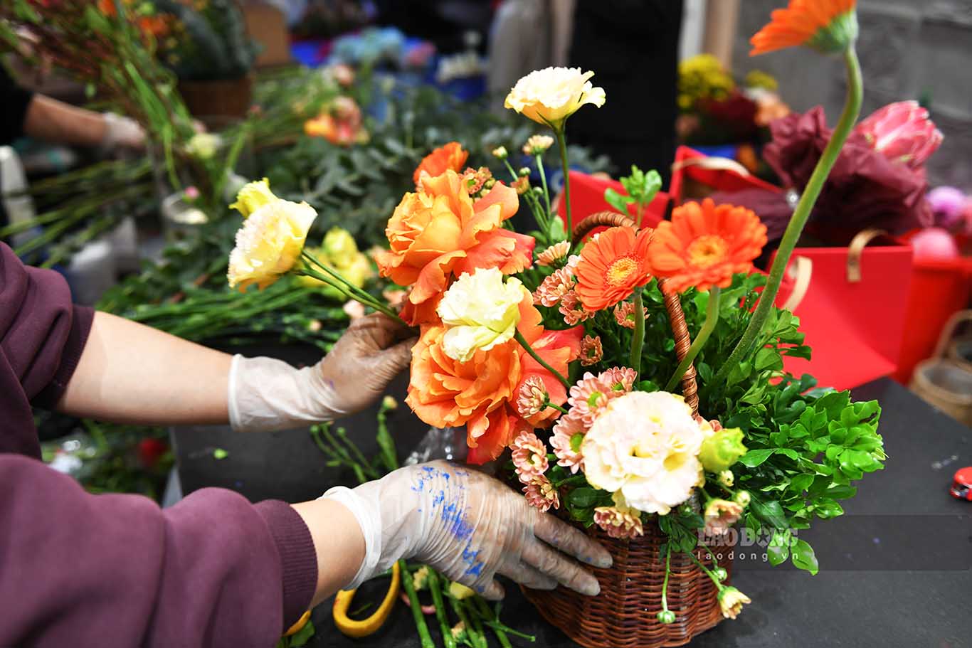 Sau khi nhập hoa về, cửa hàng thiết kế hàng trăm mẫu sản phẩm hoa tươi theo lẵng, giỏ, bó… để phục vụ thị trường.