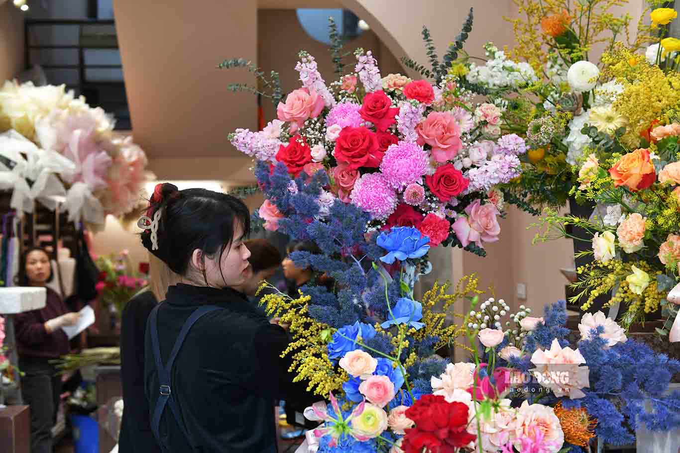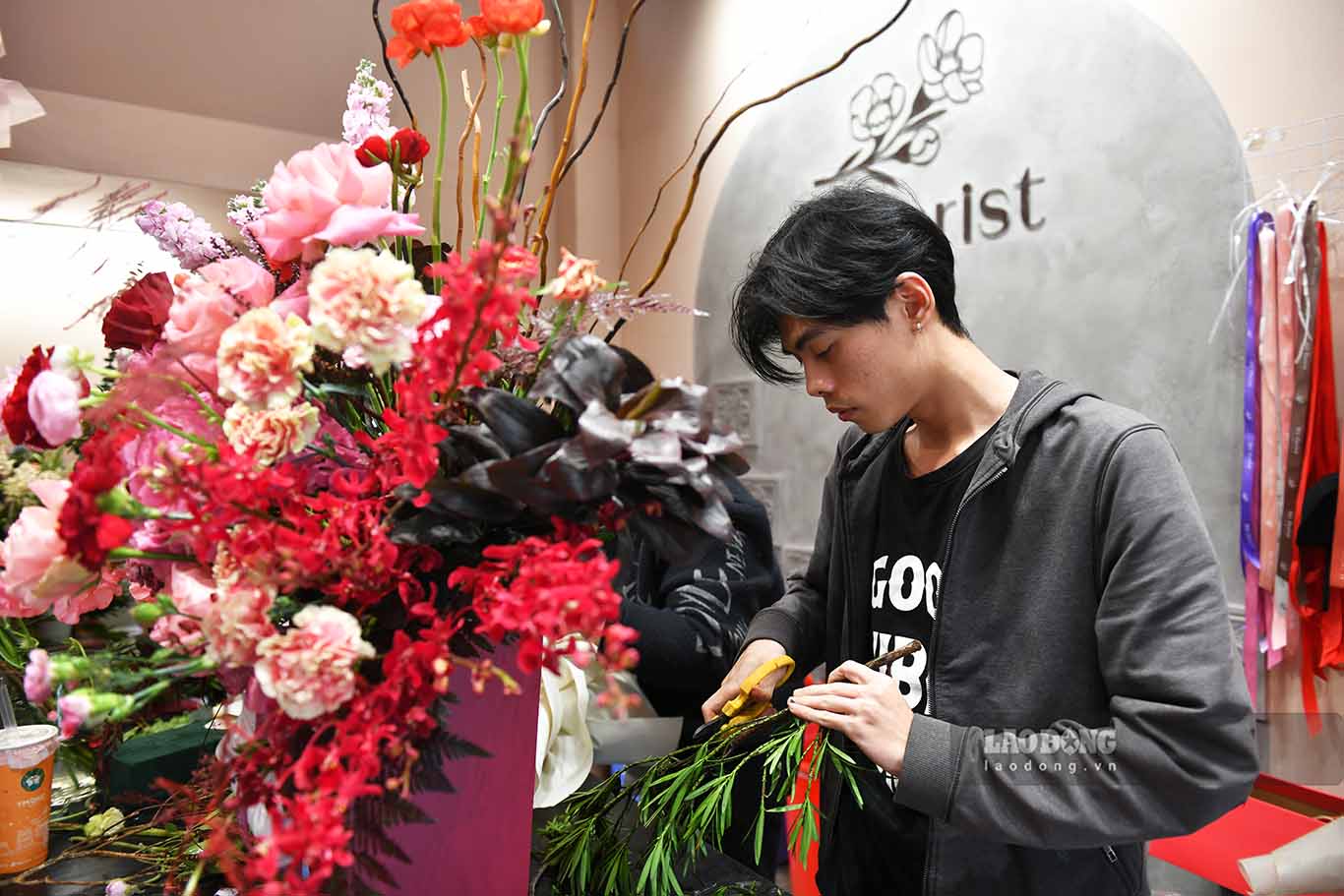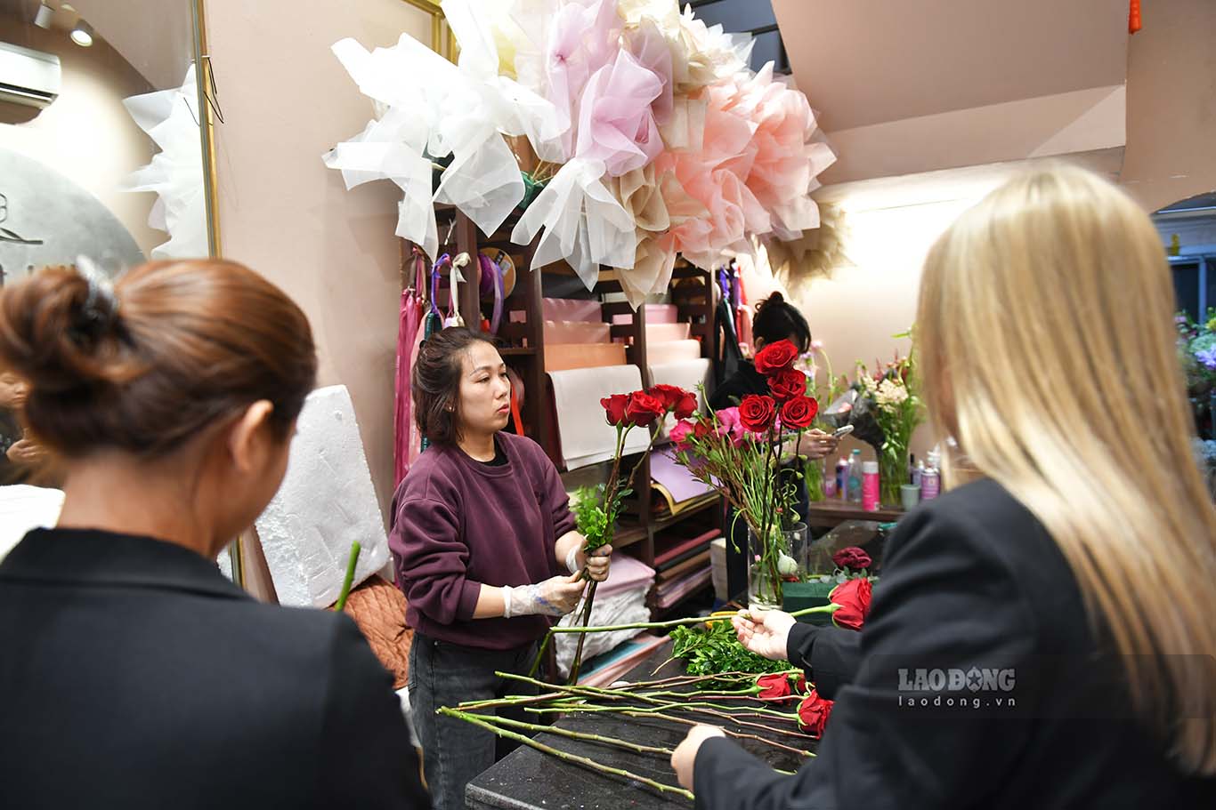 Tại một cửa hàng hoa nhập khẩu có tiếng trên phố Trần Duy Hưng (Hà Nội), nhân viên cửa hàng làm việc không ngơi tay từ sáng đến tối để kịp giao hoa cho khách.